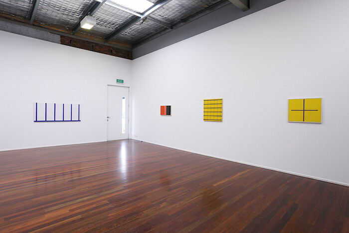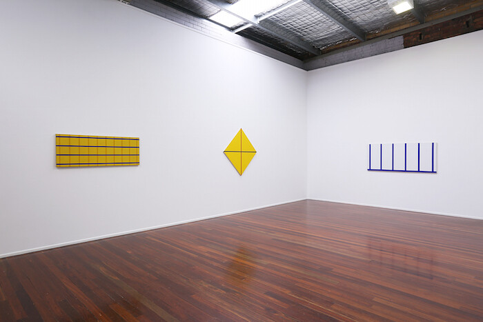 Two paintings in Ian Burn’s “London Works” frame the exhibition’s two-year time span, 1965 to 1967—a transformative and immensely productive period in the practice of the Australian conceptual artist, best known as a member of the group Art & Language. Together, these paintings tell a story of oscillation and negotiation between the signifiers and styles of two art worlds: 1960s Melbourne and 1960s London. Burn painted the first before he left Melbourne for London and the second just as he was about to depart London for New York. Figures and Flag, St Kilda (1964) is a Paul Klee-inspired work, featuring playfully scattered thick black lines that recall those painted by the German artist in the early twentieth century, highlighted with fleshy pinks and cool blues that bring to mind seabirds, bare bottoms, and other seaside charms, set in a mustard-yellow field. The painting can be read as abstract, but hints of an outside world persist. This picture also bears the influence of Melbourne’s “Heide Circle,” a group of modernist painters that included artists such as the ostentatious Sidney Nolan, whose Ned Kelly series is a national icon, painted with the black, blues, and ochre later used by Burn. The second work, demonstrating Burn’s rejection of representation in favor of pure abstraction, is one of his Blue Reflex works (1967-8), a high-gloss monochrome panel. Reflecting its environment and its audiences, Blue Reflex brings part of the outside world back into the painting.
