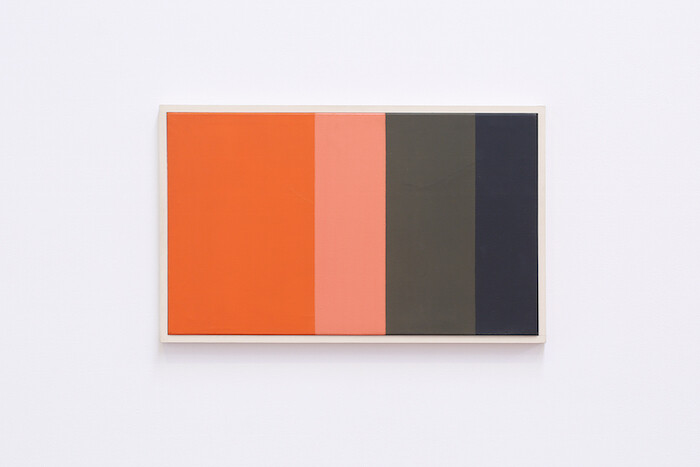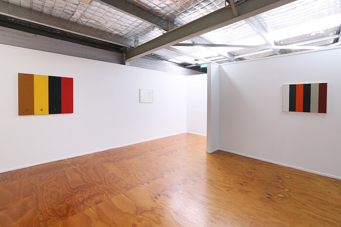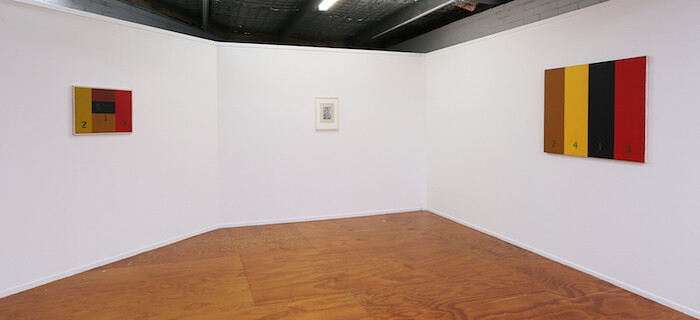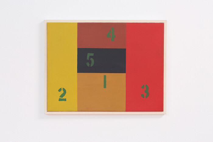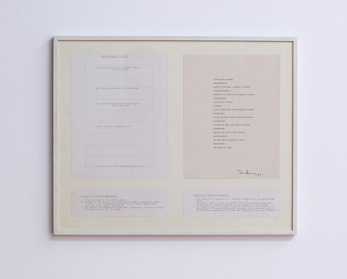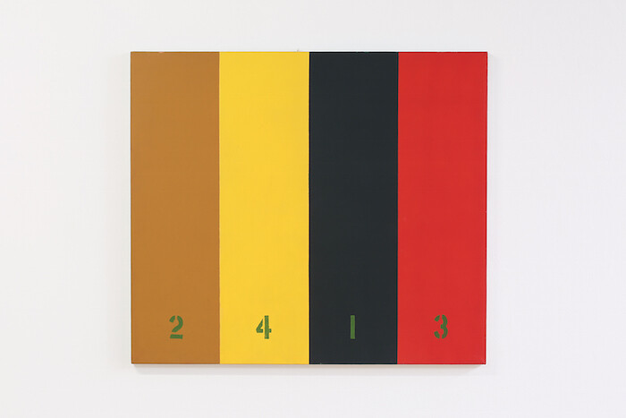 On the upper level hang a selection of works that, like the Left to Right Painting, experiment with the legibility of painting. Re-ordered Painting No. 3 (1965) creates a game-like structure to test the eye: four vertical stripes of brown, ochre, black, and red form a rectangular painting. Each segment is then numbered: brown is two although it comes first; ochre, which follows brown, is actually four; black is one; red is three. Burn suggests that the order in which you will see the colors is black, brown, red, ochre, despite the fact that they appear in another arrangement from left to right. In Word Painting (1967), Burn does away with pigment altogether and offers a carefully structured, typewritten description of a painting on standard sheets of white paper. The work tests the need for visual perception of pigment on canvas at all in the experience of a painting. This kind of experimentation points to the considerable doubt and productive questioning in Burn’s practice during this two-year period, in which he challenged the structure, intelligibility, and materials that constitute painting, creating a linguistic field in which his experiments in painting could unfold.