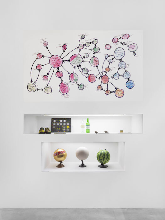 Entering each exhibition, one first encounters an enlarged drawing, a mind map consisting of a series of big and small circles, connected by various single or reciprocal arrows. Together they represent the various chapters in Block’s career as exhibition-maker, and illustrate how everything is connected. In addition to the circles standing in for Block’s gallery in Berlin and later New York (1964–79), the central stations of this constellation are the German Academic Exchange Service DAAD (1982–92), where Block was responsible for the art and music sections, the Kunsthalle Fridericianum in Kassel (1997–2006), and several international biennials since the 1980s.