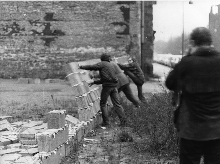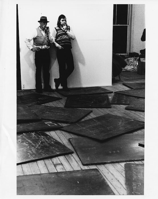 Observing the carefully designed early printed matter and catalogues published by Block leaves little doubt that they were meant to be part of a larger oeuvre from the beginning, a legacy that might end up a museum. And here it is. From piece to piece, the aforementioned curatorial building enfolds, with Beuys, Fluxus, and music as cornerstones. There is rarely seen documentation of the many soirées, performances, happenings, and Fluxus concerts that played a major role in Block’s intermedial gallery program—among them Wolf Vostell’s first happening in Berlin at a car dump (Phänomene, 1964), or Allan Kaprow’s Sweet Wall, which he erected with a handful of participants in November 1970 on an empty lot near the actual Berlin Wall using bricks, bread, and marmalade. Less known are the first institutional exhibitions that Block organized in the 1970s: “The Berlin Scene 72” in Stuttgart, London, and Hannover; two thematic shows about graphic techniques and multiples (his personal interests as a producer and dealer) at Neuer Berliner Kunstverein; and one at Berlin’s Akademie der Künste in 1976 about New York’s emerging artists’ quarter in SoHo. Two years previous, Block had opened a satellite of his own gallery in SoHo with Beuys’s legendary performance I like America and America likes Me (1974), in which the artist, having been driven from the airport to the gallery in an ambulance and wrapped in felt, spent days locked in a cage with a coyote, before leaving the US the same way he came. On September 15, 1979—at which point many of the artists with whom Block worked were commercially successful—Block closed the gallery. Under the laconic exhibition title “Ja, jetzt brechen wir hier den Scheiß ab” [Yeah, let’s end this shit now], Beuys hammered the plaster off the walls. Block, who was, after all, the co-initiator of the first art fair in Cologne in 1967 (Kunstmarkt Köln, now Art Cologne), and organizer of the 3rd and 4th Internationale Berliner Frühjahrsmesse (International Berlin Spring Fair), left the market just before the big commercial boom, and moved into new fields of activity.