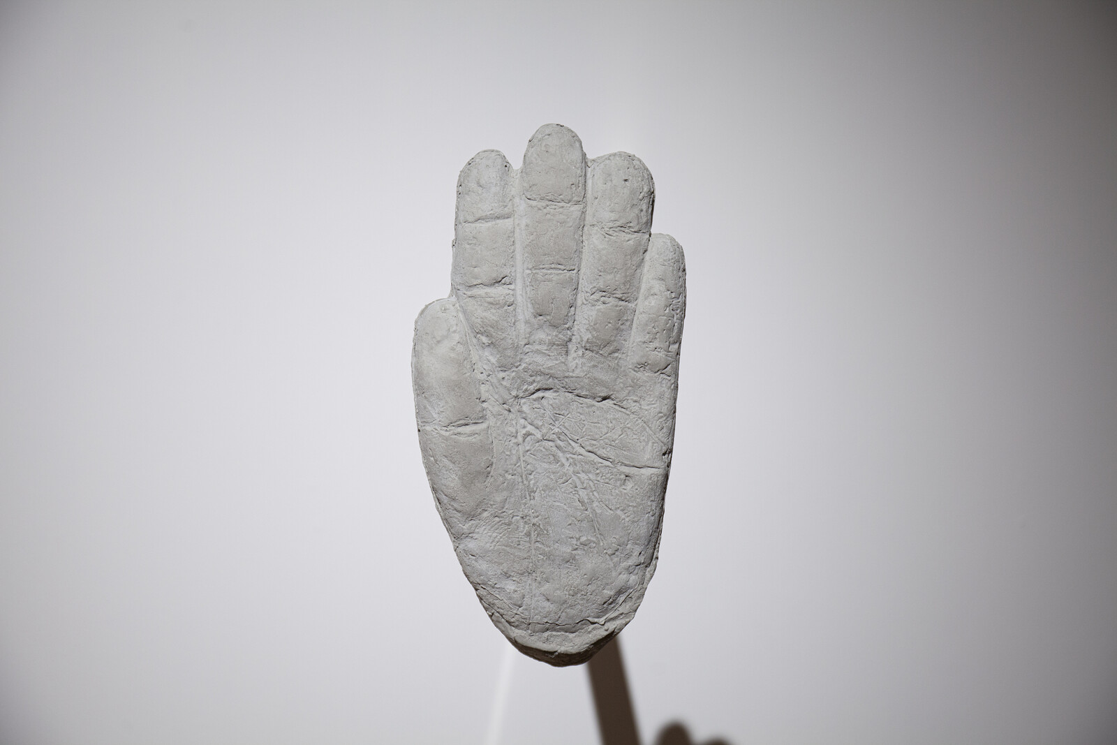 Visitors are greeted by Buddha High Five (all works 2024), a cement hand, larger than life and affixed to a 70 centimeter steel pole that protrudes from the gallery’s white wall. Installed around eye-level, the hand exhibits scars of its casting: scant effort has been made to amplify any lifelike qualities. ikkibawiKrrr imagined the hand as an intervention of critical fabulation: the scale is derived from a limbless Maitreya statue the trio encountered in the countryside, while the form recalls the abhayamudra, a gesture proffering reassurance and allaying fear.