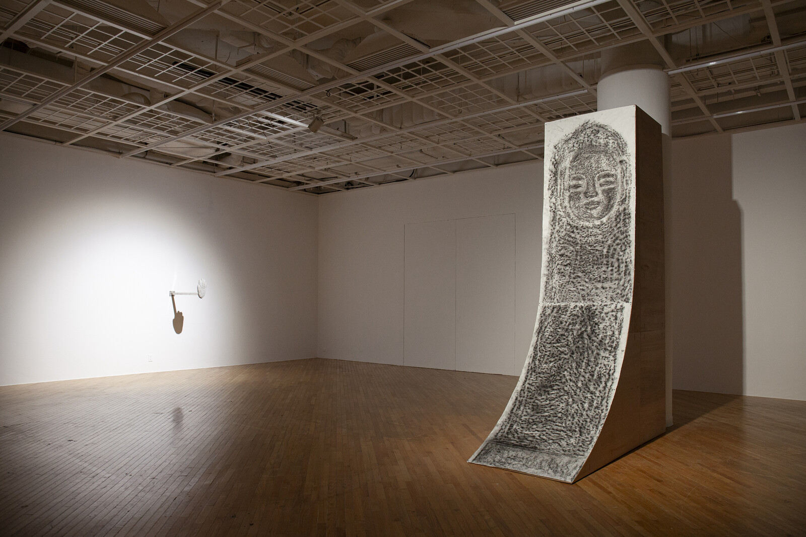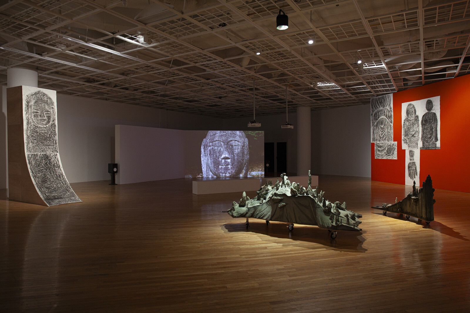 The exhibition’s title lends itself to two works: a two-channel video projected onto abutting freestanding walls, and a reproduction of a Maitreya discovered in a rice paddy. Dual images show sweeping vistas, close-ups of carved faces of rock statues, and contemporary trappings of industrialization. Accompanied by a score that oscillates between trembling and ambient, the video comprises footage the group shot over their yearlong journey visiting over sixty sites in search of the statues.