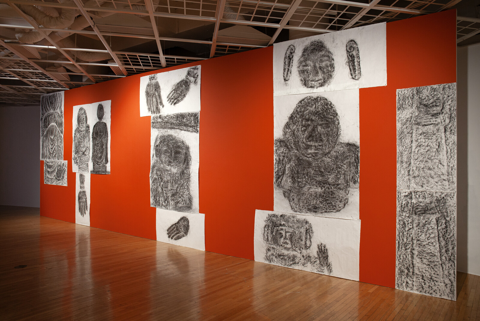 Covering a third of the wall space in the gallery is Rock n’ Feel, an assemblage of charcoal rubbings on hanji, traditional handmade paper, of various body parts from a range of deserted statues. Hung against a safety-orange wall, the rubbings produce an exquisite corpse of outsized hands, angular feet, and rough-hewn rock torsos in cartographic detail. In front of this wall is the Maitreya reproduction, with its enormous head sporting an expression of tranquility, alongside Everybody Mountain, a miniature rendering of craggy peaks–the semblance of a landscape painting turned on its side and rendered in three dimensions. Like Buddha High Five, no gesture has been made to obscure the obvious human-made qualities of these sculptures.