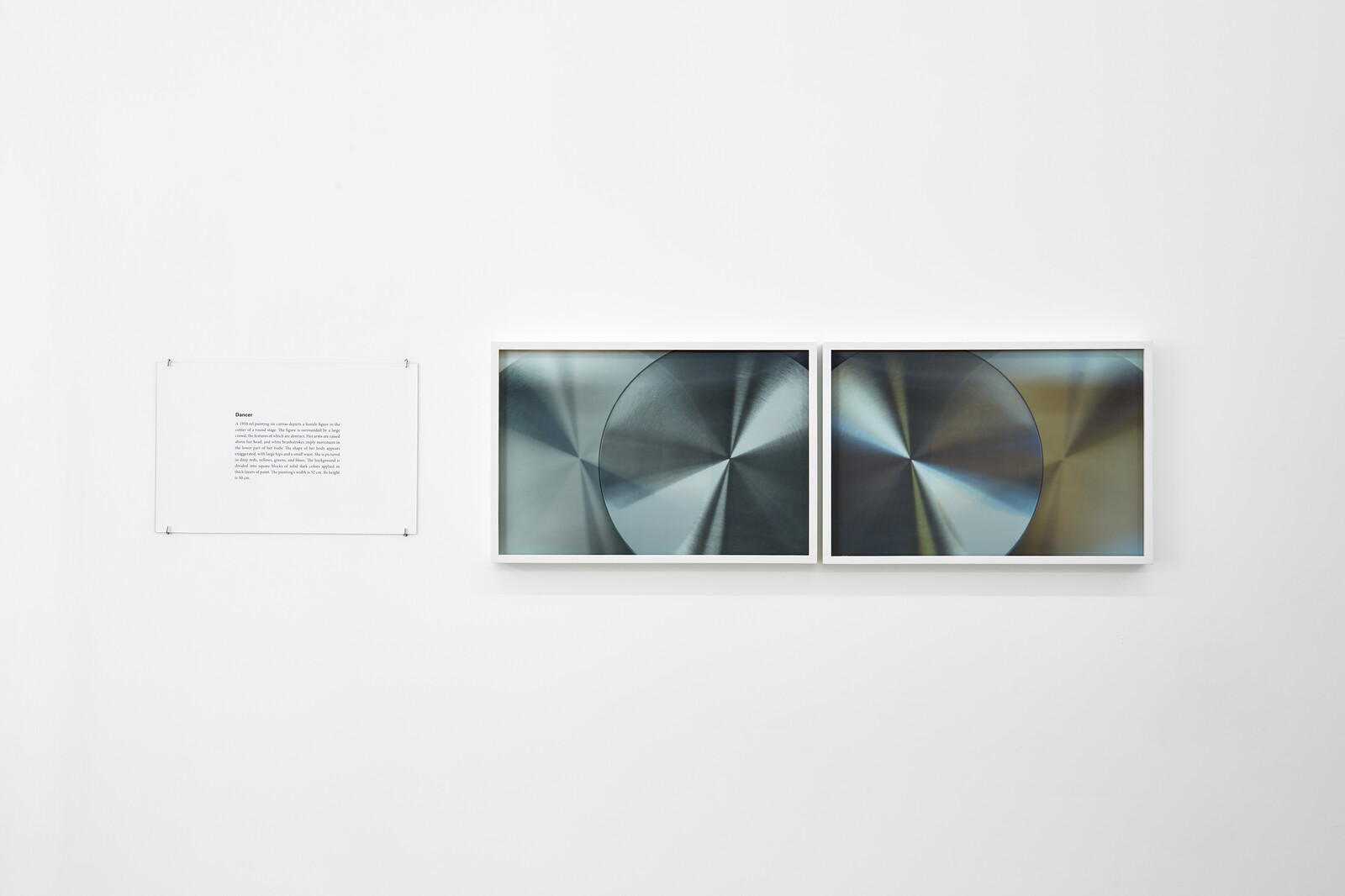 How to make sense of two things that seem to have little to do with each other? The two lenticular prints hanging side by side in Dancer (study for 2014) (2014) depict two iridescent, metal-colored empty Venn diagrams. How do they relate to the text on the wall that refers to a “1954 oil painting on canvas depict[ing] a female figure in the center of a round stage”? Text and images inform each other: thus what is described—a crowd whose features are abstracted, a dancer’s arms moving, her large hips—become the round shapes repeated in the prints, abstracting ideas into material. The text in Harvest (study for 2014) (2014) describes “two human figures in a golden-colored field” (a 1957 oil painting). Next to it is a video, presented on a flat screen, in which an abstract color gradation shifts slowly, almost seamlessly, from pink to orange, then green to a gray-ish blue, back to white and pink. Though the focus on light and color in both the painting and the video suggests a clear connection—the stuff of visual analysis: light, color, movement—it remains a suggestion.