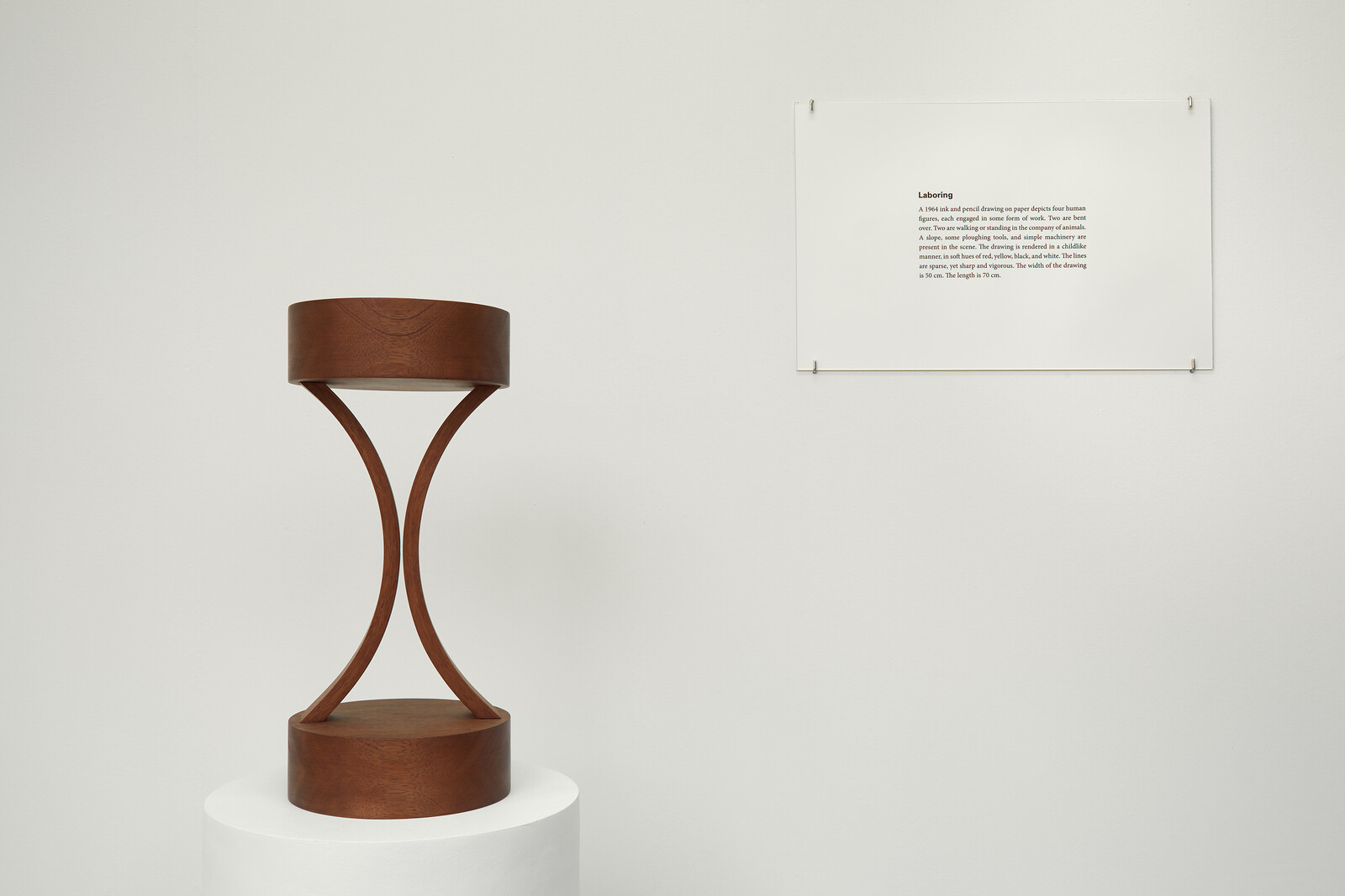 What is the role of description in the way we talk about art? In art-historical discourse, iconography won out over formal analysis. The focus on line, color, and shape was replaced by the primacy of the subject matter. But more often than not, talking about art means talking about stuff in spaces, and so the first order of business is to describe what’s there: clarify what you’re talking about, then talk about its context. Description thus functions as a placeholder for the object, only unlike images and installation shots, description has agency and tacks meaning onto an artwork. Iman Issa’s exhibition “Lexicon” fields this process. “Lexicon” is a series of 13 displays, done between 2012 and 2014, in which Issa remakes historical artworks—drawings, oil paintings, lithographs—by presenting framed texts detailing the work she is responding to (which, despite the descriptions, always remain undisclosed) alongside new objects that reinterpret them.