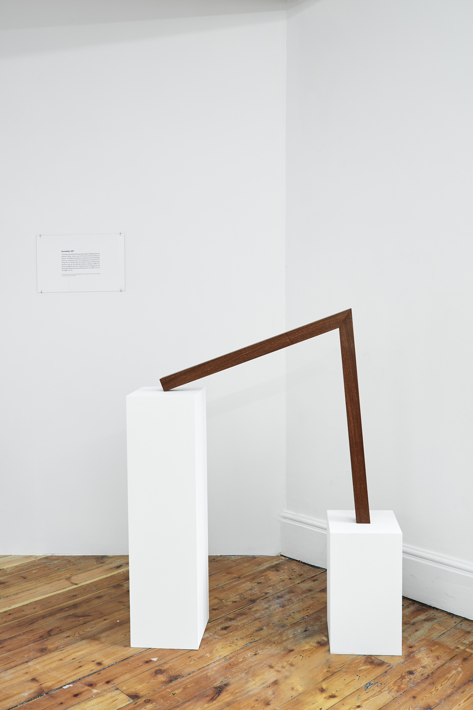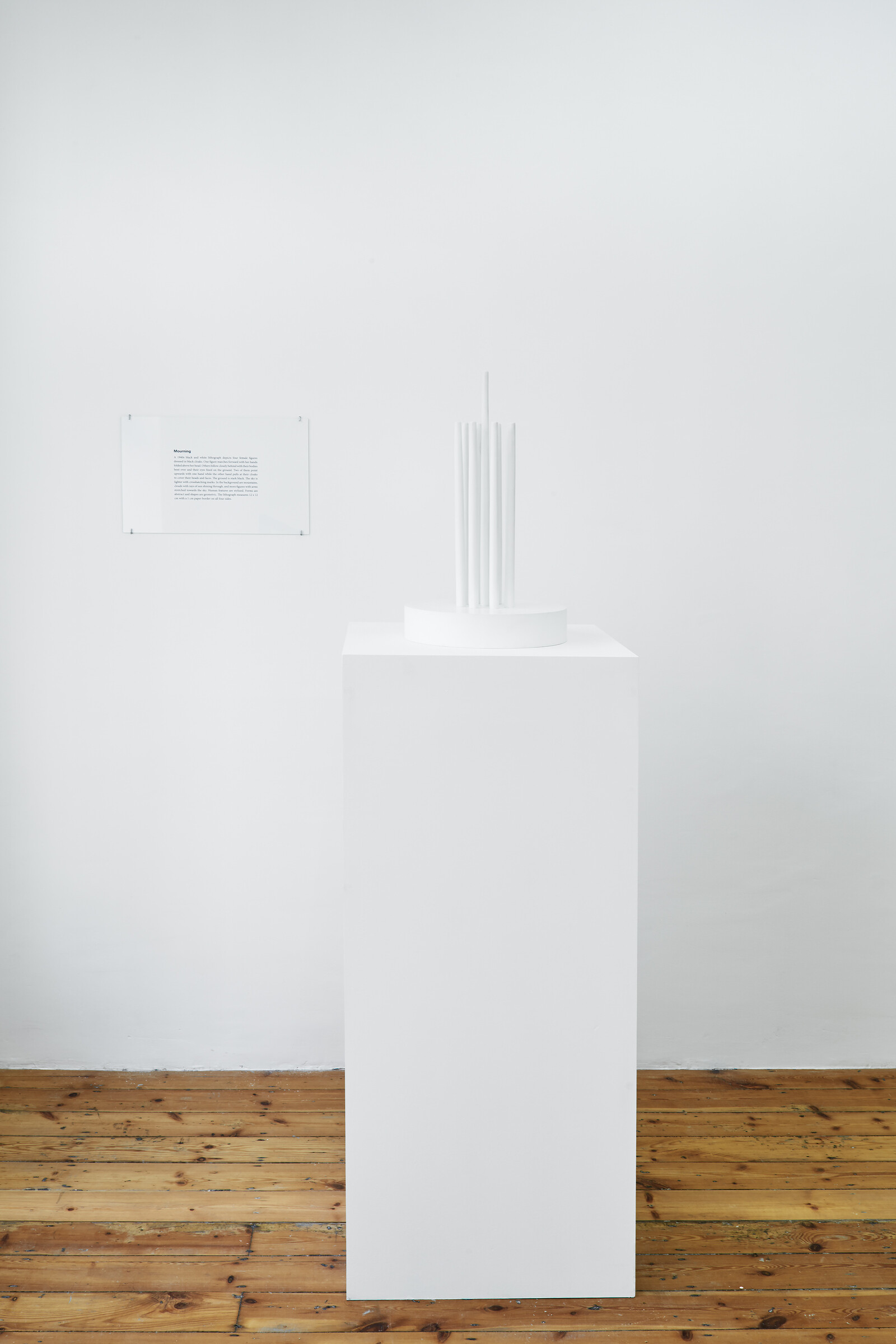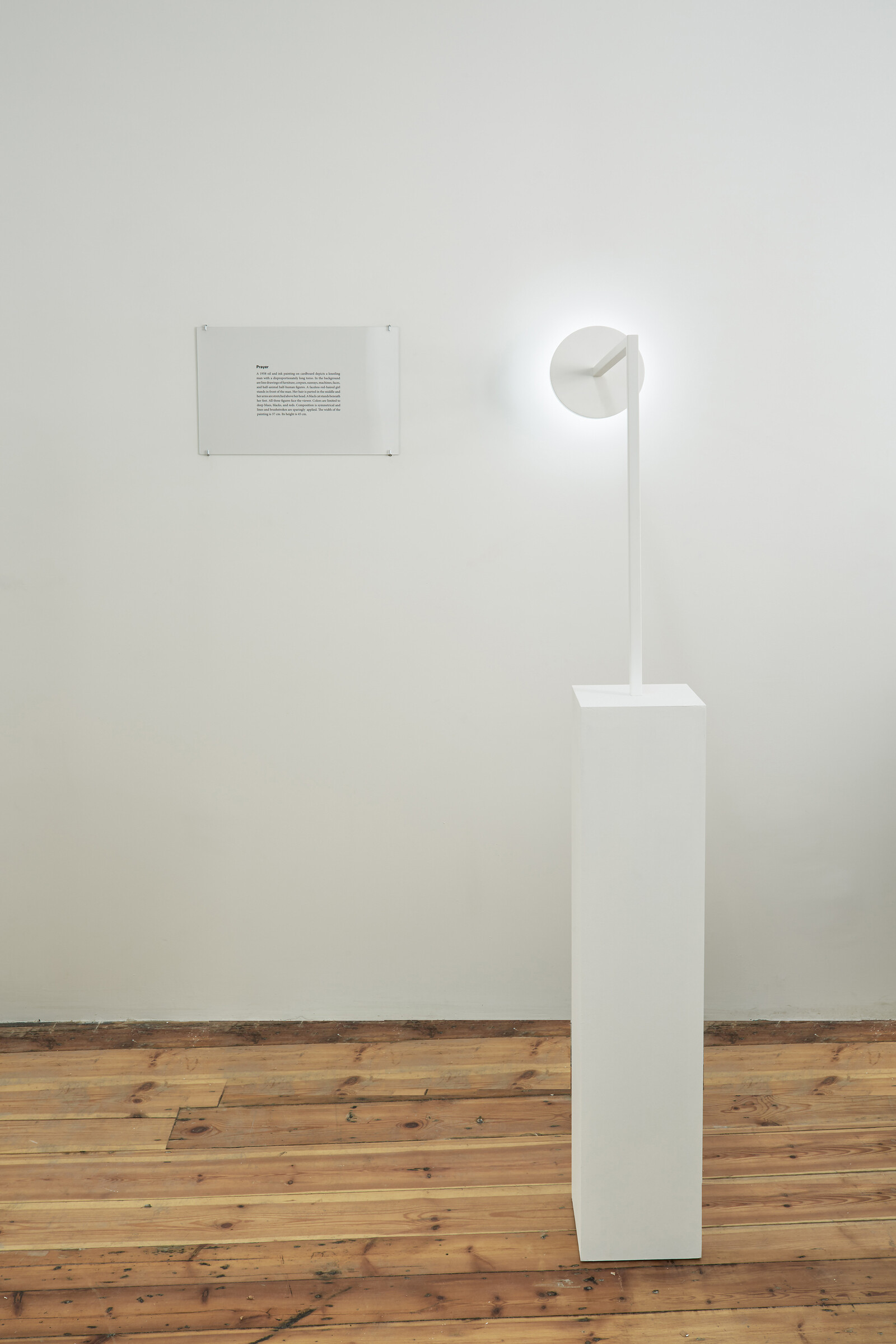 What describes what? The relationship between the re-creations and the works they were born of is permeable. The titles of the original works are linked to—but not descriptive of—the pieces created by Issa: sculptures placed on white plinths, a video screening in the back office of the gallery, and framed prints. But the texts she writes describe something that isn’t present, objects never shown in the space. According to its text, Prayer (study for 2014) (2014), is a 1958 oil-and-ink painting on cardboard depicting a kneeling man. It reads, “Colors are limited to deep blues, blacks, and reds. Composition is symmetrical.” Next to it is a white metal sculpture on a whitewashed wooden plinth. It consists of a vertical metal bar that curves toward the wall in a 90-degree angle culminating in a small, flat, circular form. An LED light attached to the interior of the circle glows against the wall, producing a round aura. This white-on-white-on-white is far from recalling the deep blues, blacks, and reds of the painting described in the text; the metal does not bring up a human form like the one mentioned in the text. Yet the conflation of text and sculpture illuminates the words in the light of an object that doesn’t give much by way of subject at first glance, and it allows an abstract sculpture a sense of narrativity by its link to the historical work.
