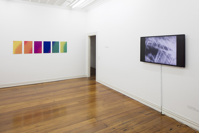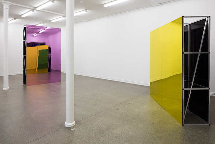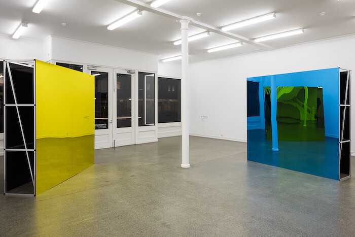 The exhibition opens with Rebecca Baumann and Brendan Van Hek’s collaborative work Untitled (2015), a minimal set of three mirrored acrylic panels, tinted in CMY primary colors (cyan, magenta, and yellow) and mounted in aluminum frames. Though static and flat, the work positions the visitor as a performer-spectator in a room of mirrors, in which movement and reflection, light and color, orchestrate an altered perception of space. The panels create a trompe-l’oeil effect: the white, neutrally lit gallery transforms into a cold blue, warm pink, or garish yellow room respectively, while the visual combination of panels results in mixtures of red, blue, and green. But despite its attractive color and sense of play, the installation is only fleetingly captivating, leaving little impression of the experience on the viewer.