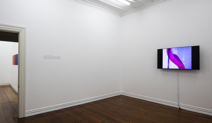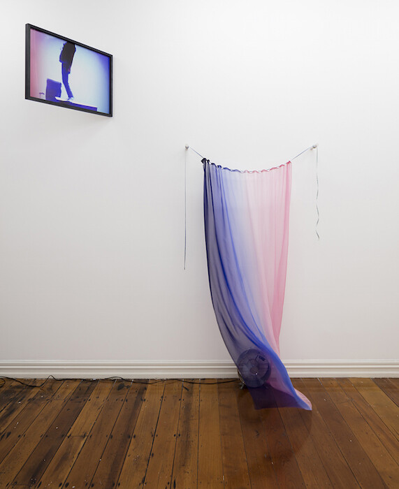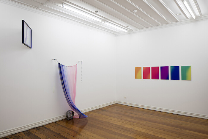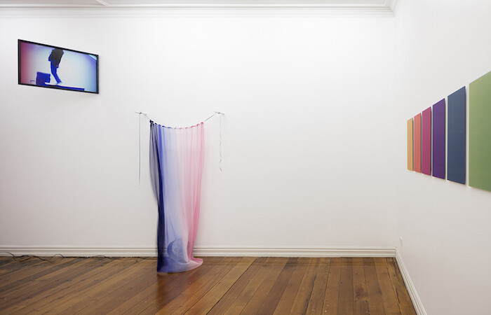On an adjoining wall are two intriguing works by Berlin-based New Zealand artist Alicia Frankovich. Becoming Public: Actor (2015) is a framed photograph installed as if balancing at a 40-degree angle from the wall. It depicts a body in a static position of equilibrium—with heels up and knees slightly bent—backgrounded by a gradient of dark purple to light pink. Next to this is Frankovich’s The Female has Undergone Several Manifestations (2015), a diaphanous curtain of the same color gradient; it hangs from a ribbon, dancing to the rhythm of a soft breeze produced by a small fan on the floor. Intimate but autonomous, these works—connected by their chromatically matching palettes, whose gradual movement from one color to the other perhaps indicates an intensity of motion—appear as translations of an action into an object or vice versa. This substitution blurs the boundaries between subject and object, proposing two apparently antagonist entities as inherently linked by a performative nature. The viewer, prompted by the connection between the two pieces, can envision the motion of the body in the photograph, and with it, a narrative.