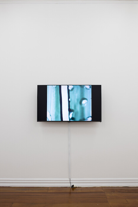 Meanwhile, the third and last room of the show features a work by Len Lye, a significant twentieth-century New Zealand artist who lived in London and New York, making contributions to the development of experimental filmmaking and kinetic sculpture. Considered to be one of the most influential animation films in history, A Colour Box (1935), also shown in a digital version on a wall-mounted monitor, is a painting on celluloid in which multi-colored and multi-layered abstract imagery—squares, grids, circles, organic forms, and text—blink and dance to the polyrhythmic “La Belle Creole,” a beguine by Don Baretto and his Cuban Orchestra. This film, like the entire exhibition, has a joyful, atemporal tone that emerges through the combination of a diversity of forms, movements, and rhythms.