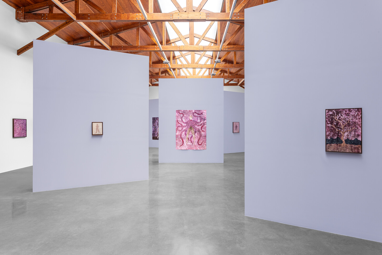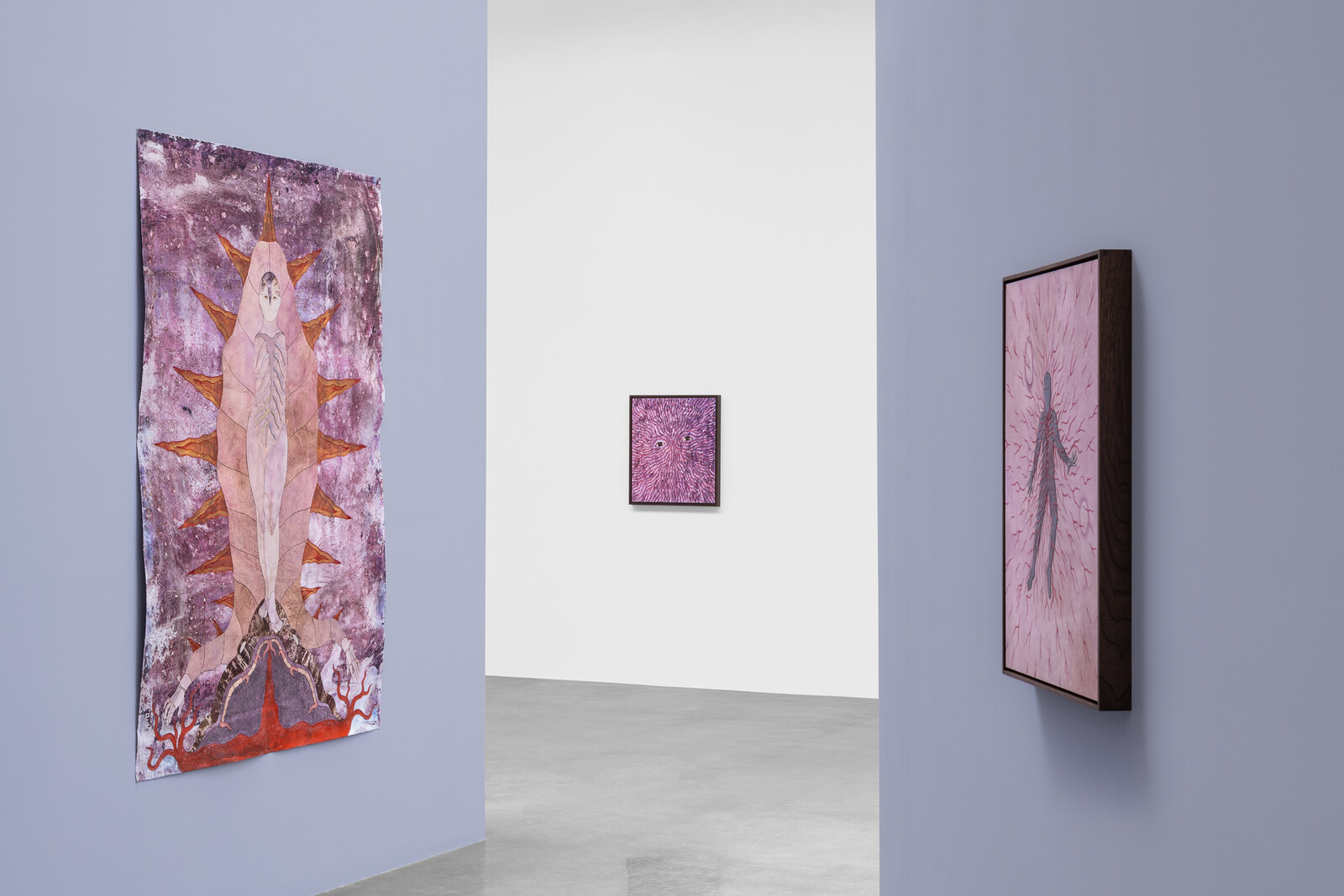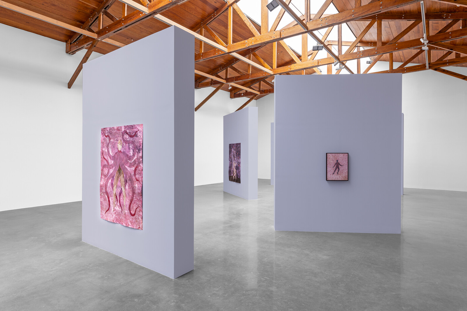 To feel a then and there is Felipe Baeza’s first solo exhibition at kurimanzutto. The show brings together portraits, composite works that combine printmaking, collage, and embroidery, and glass sculptures. Its title references the book Cruising Utopia: The Then and There of Queer Futurity (2009) by Cuban theorist José Esteban Muñoz, who proposes a shift in time and space to reveal the insufficiency of the present and to open up the possibility of imagining alternative futures.