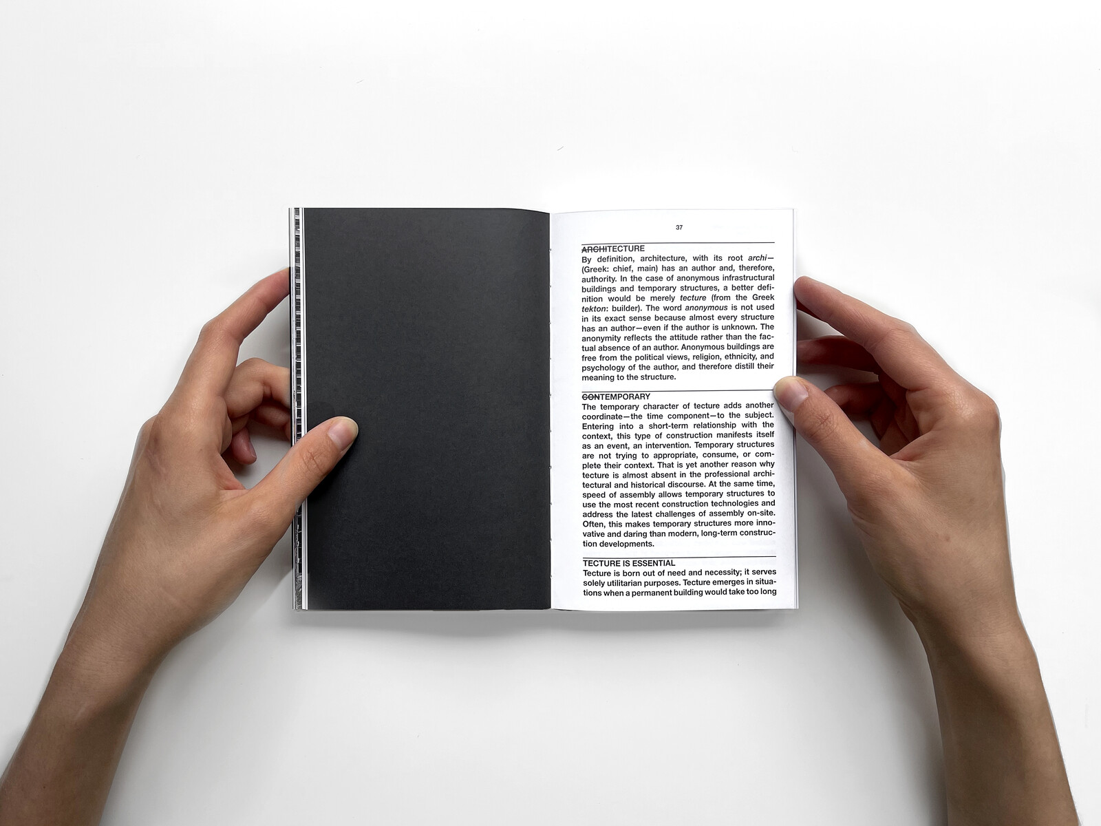 By crossing out “Archi” in the “Architecture” and highlighting “Temporary” in the word Contemporary, the book emphasizes its focus on temporary structures that lack declared authorship and are characterized more as a practice rather than project. In this sense, these construction solutions can be perceived as a form of contemporary vernacular.