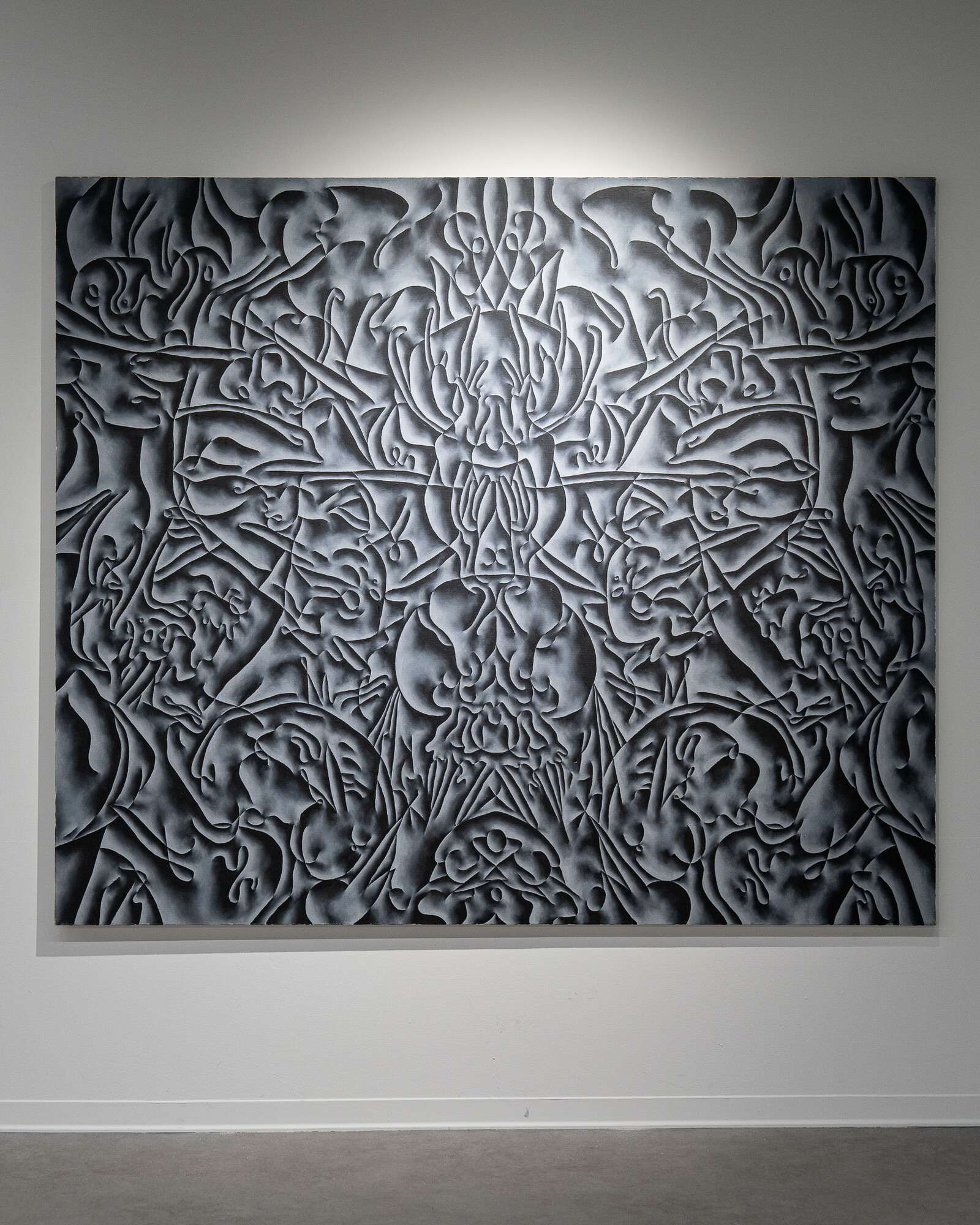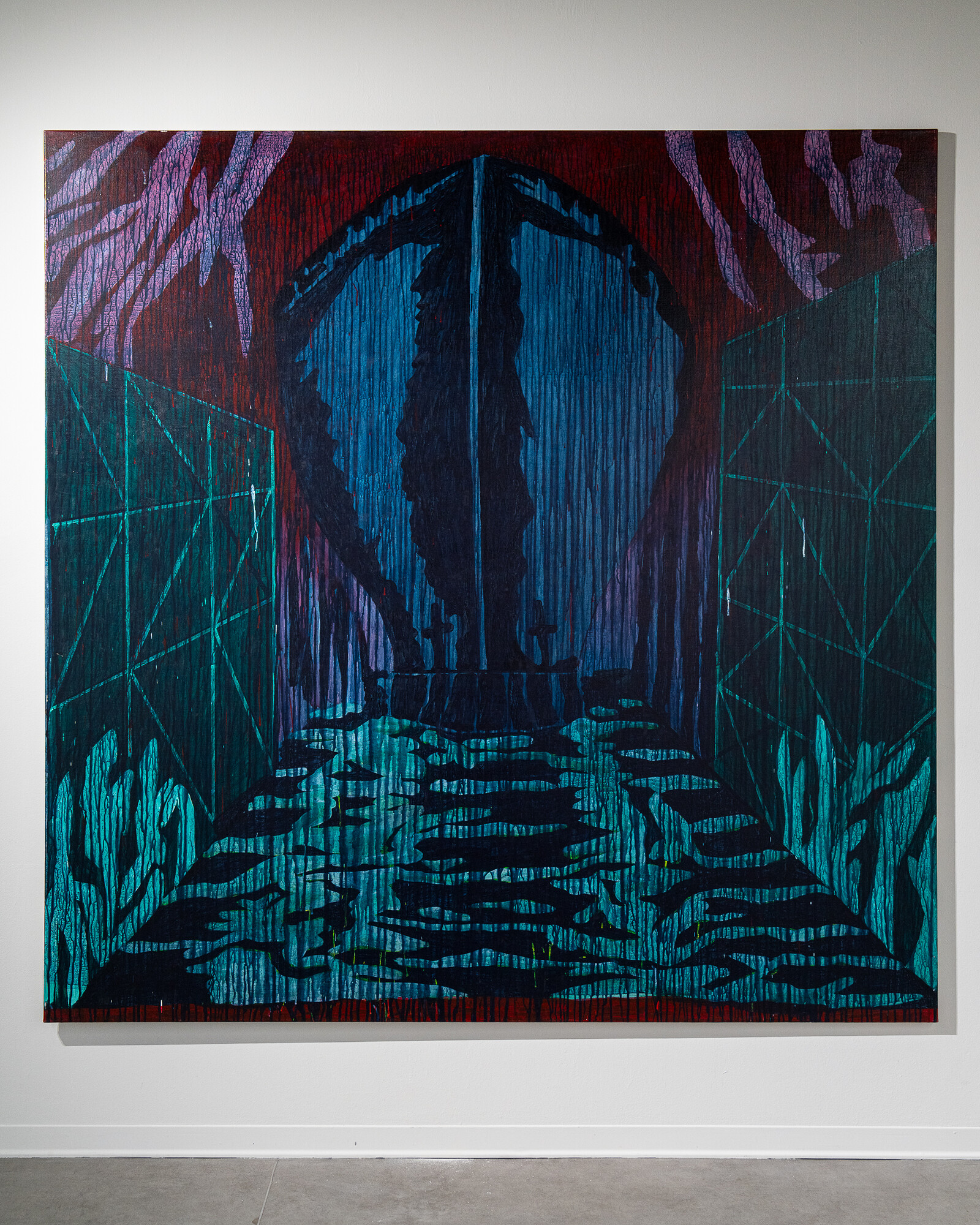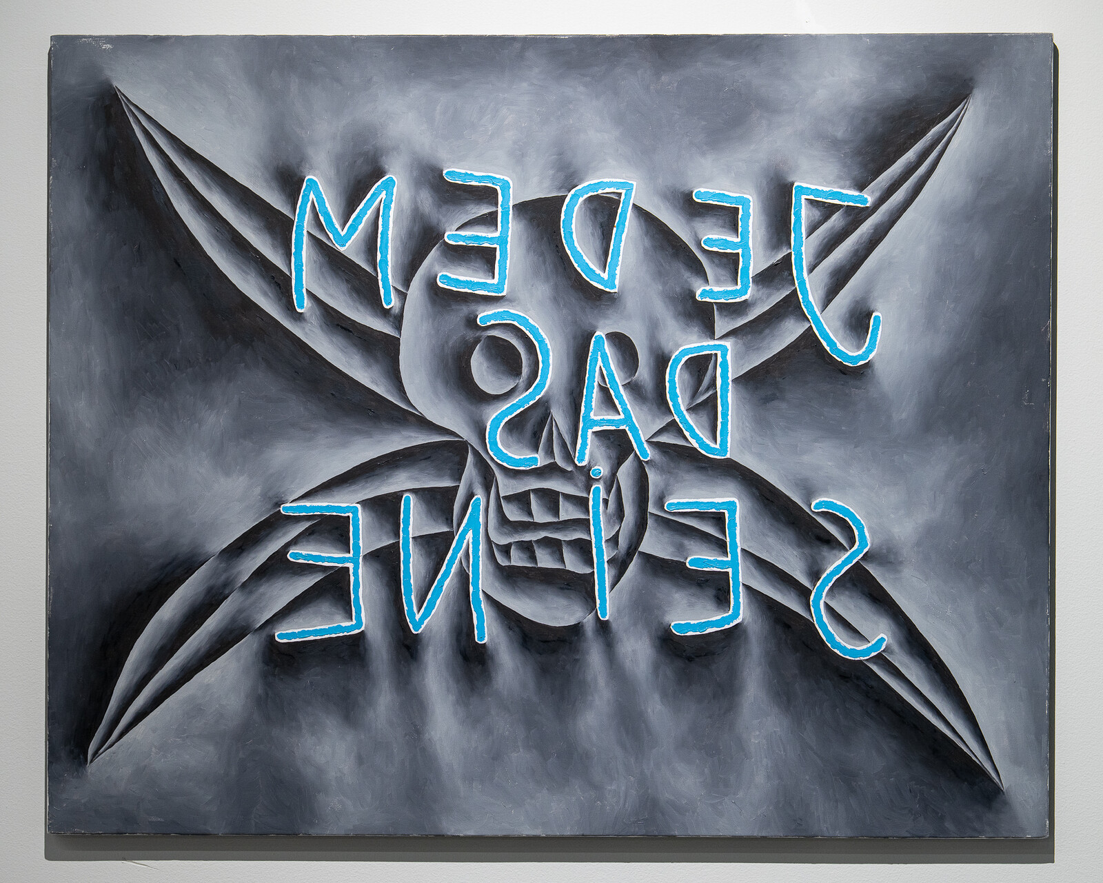 Other paintings embody a tension between figure and ground, the constitutive poles of our visual experience, which in their interplay delineate depth and scale. This reciprocity is collapsed when figures dissolve into grounds or grounds swell up to usurp the visual field, turned into a space of static vertigo. Such reciprocal concealment or convulsed indistinction delineate of a cosmos of uninhabitable spaces and nearly disembodied characters, figures of figures. The tension crops up in works with different themes and scales, such as architectural models, funerary enclosures, furniture items, implausible spaces populated by emblems rather than objects, zoomorphic waves or nocturnal clouds—in different ways profiling a no-one against the backdrop of a nowhere to make images in equal parts captivatingly palpable and alienatingly neutral. Two voids meet, or perhaps the same void—captured in a mood that fuses the febrility of an apparition and the exactitude of analysis, ecstasy and disbelief—is folded to resemble the shape of a body or that of its place in the world. Forms, emblems or diagrams of bodies, images of other, more powerful images, appear to float in a vacuum, or appear as if they were pinned onto the smooth curtain of an abyss.