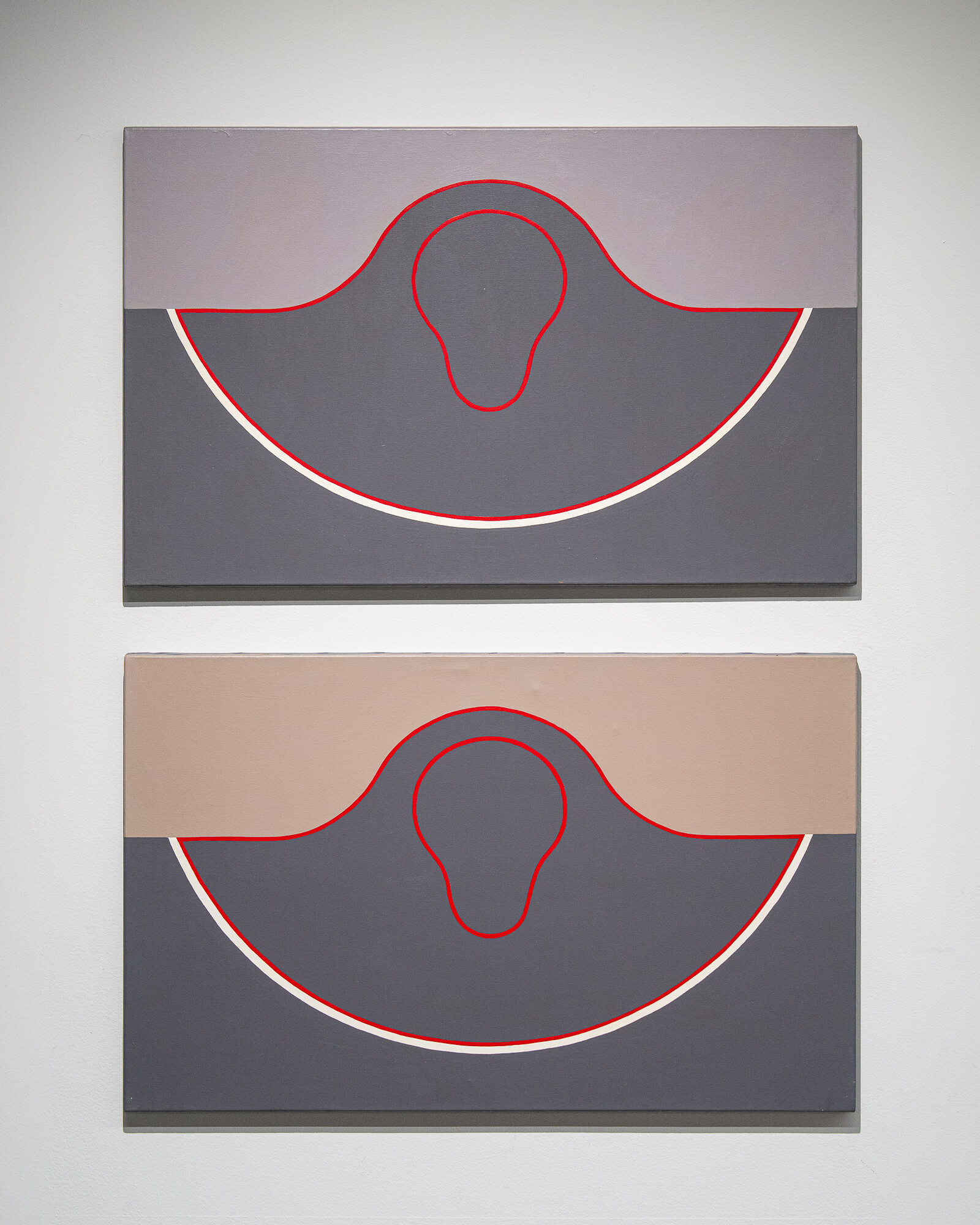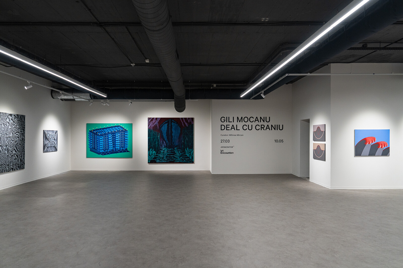 This is a compressed retrospective of the practice of Gili Mocanu (b. 1971, Constanța), one of the most original painters active in Romania today. His idiosyncratic, sprawling, consistent alphabet of forms and operations is approached from the vantage point of the body—sublime and grotesque to equal extents, sectioned and recomposed – and that of text, the script coordinating or confusing the body’s vagrancy through the painter’s oeuvre, text itself reversed or mirrored, amputated, amplified or muffled. Hill with Skull, the 2007 work from which this project borrows its title, is a case study for the formal and conceptual threads which, the exhibition proposes, interweave in Mocanu’s practice. The work is double—two paintings offer chromatic variations of the encounter between a skeletal landscape and a cranial near-abstraction. Rather than elegiac or archeological versions of the scene, the two iterations are neutral renditions of a diagram of spatial disorder, which compresses the play of distances across which those two objects would be seen, resolving it as ghostly simultaneity: to look at the skull is to unsee the hill, to see the hill presupposes a distance which reduces the skull to a speck, a grey smear in the grass, a distance which symbolically renders it inert once more. Text – the title of the paintings—is a dynamic element in the work, intervening in the image to identify spatial interlocutors and to assert their scalar incompatibility, to measure as much as appease the violence of their not fitting together.