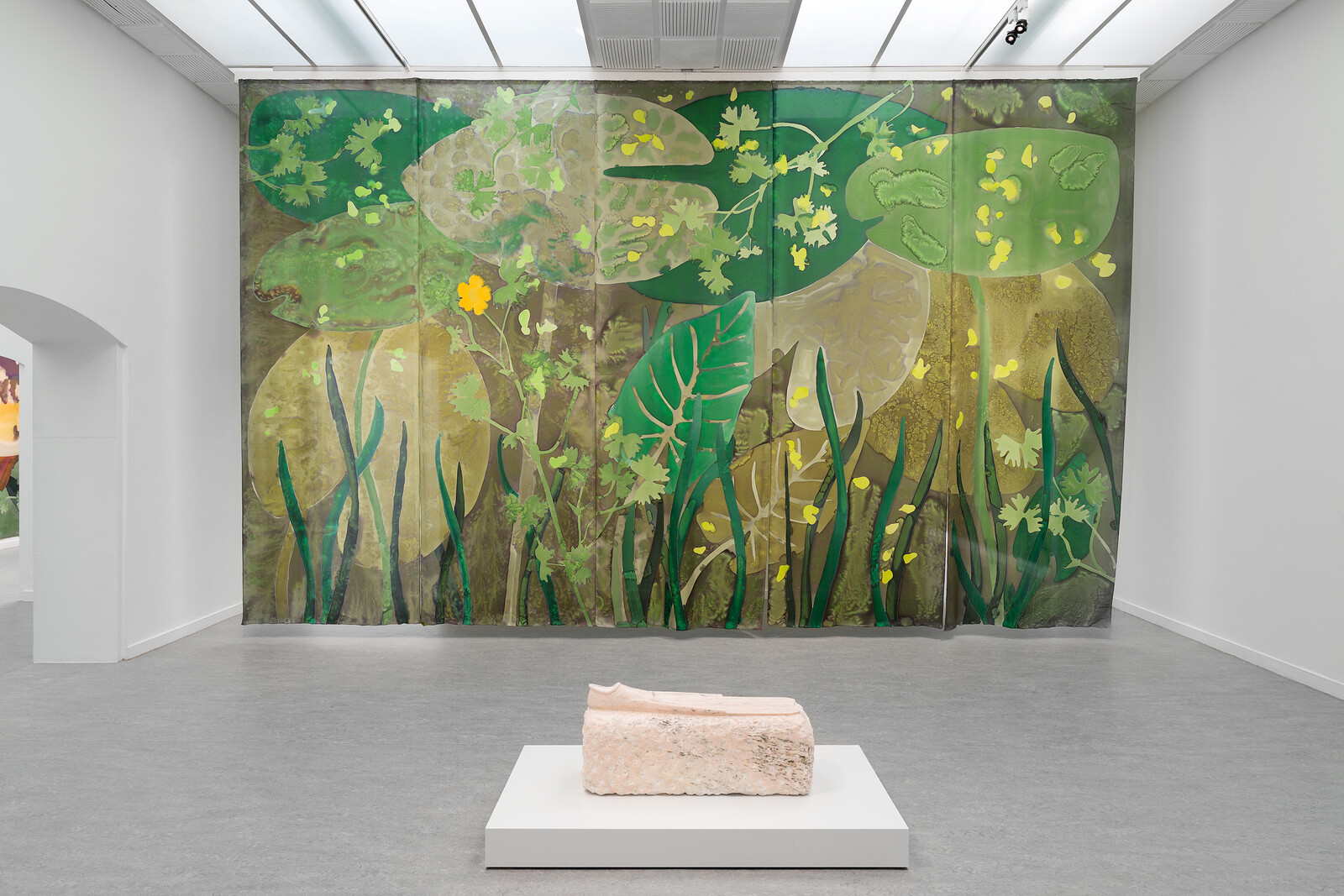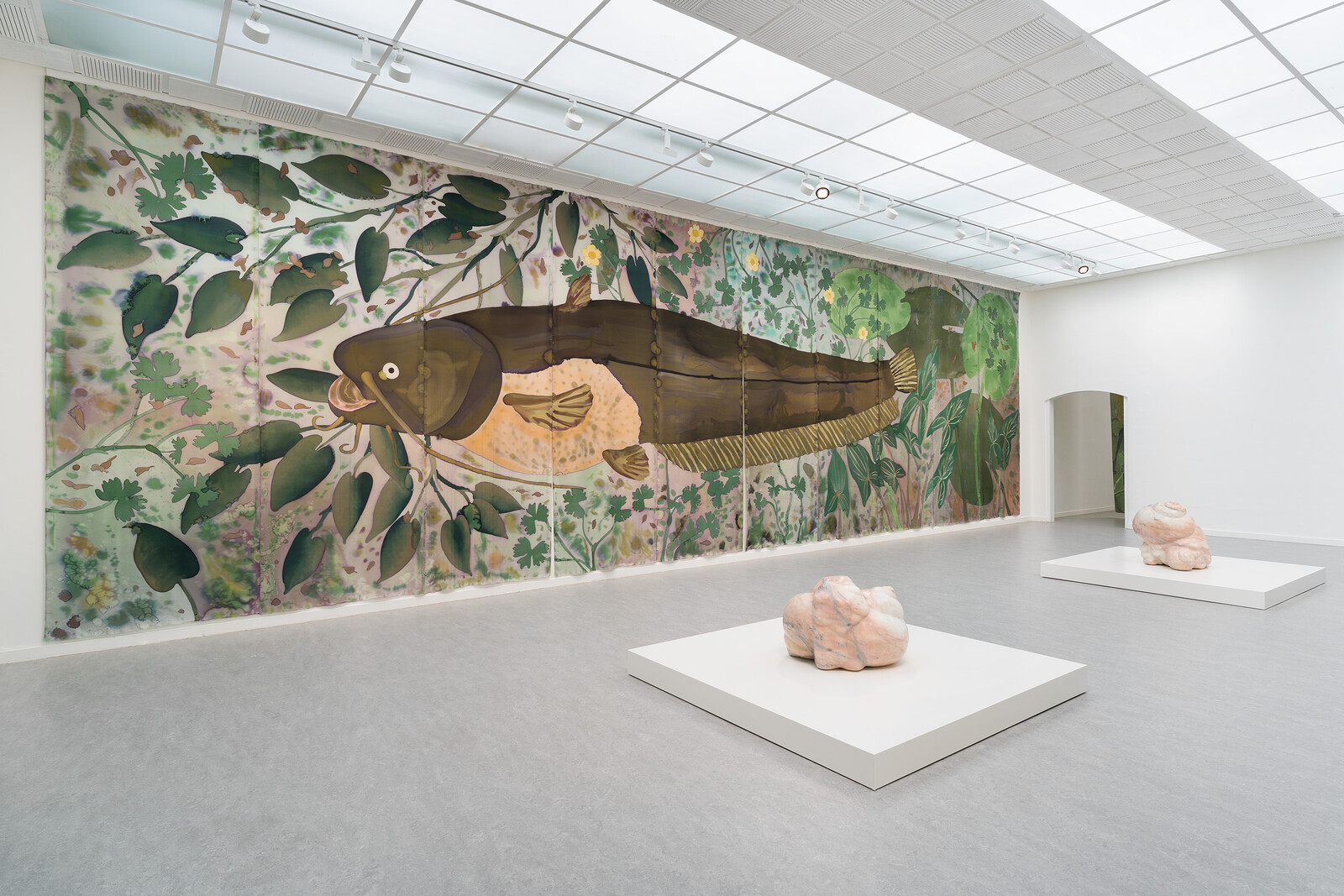For their solo exhibition at Z33, Dewar and Gicquel have embarked on the production of a new monumental silk painting, which streams through the five galleries of the historic Vleugel 58. For this epic painting, the duo have chosen to depict a river scene with freshwater fish. As companions to this immersive aquatic scene, Dewar and Gicquel present a new series of sculptures made of stoneware ceramics and pink marble.
