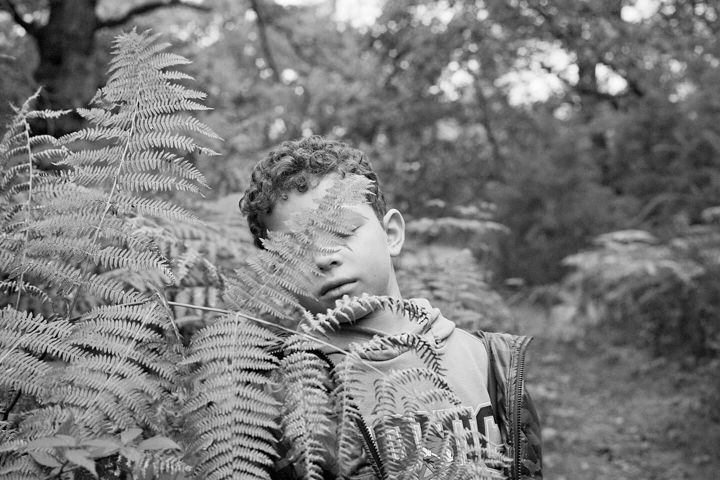 Set within the ancient woodland of Abbey Wood in South London, Minnicucci’s poetic black-and-white images foreground her roles as artist, mother and teacher. Layers of light and fragmentation draw attention to subtle shifts in body language, inviting us to consider what it means to be truly vulnerable. As gestures slip behind leaves or linger in dappled light, the artist asks: what does it mean to be unguarded? What do we reveal of ourselves to each other?