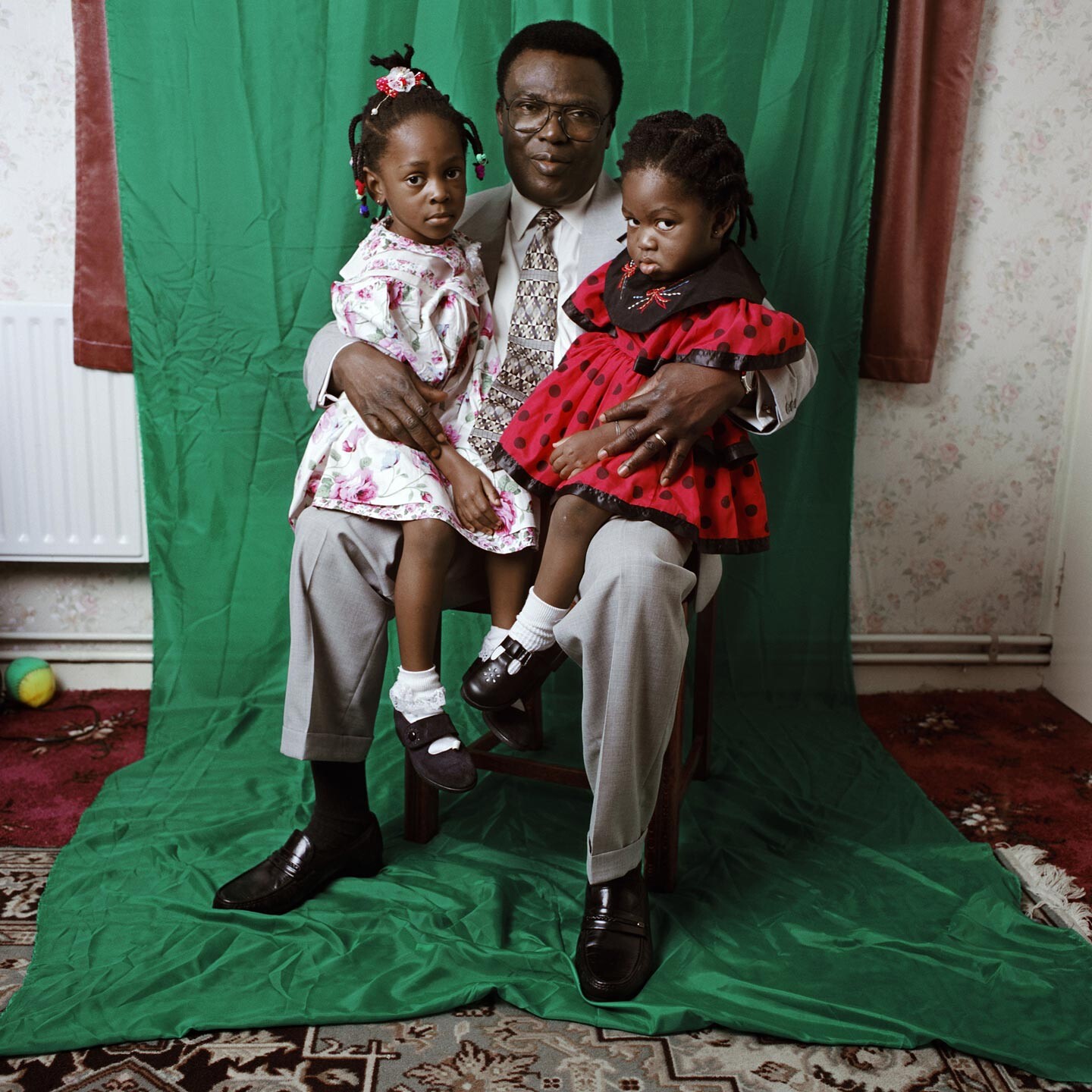 Perrier works with and within communities: this spirit of collaboration extends to her own family in Red, Gold and Green. In this series, she worked closely with three generations of British Ghanaians and relatives from her extended family to create portraits in their London homes. Using vivid fabric to create a temporary studio, these images draw on the long tradition of African studio portraiture. These are shown alongside portrait projects spanning Perrier’s career, from gentle explorations of kinship and memory in Ghana, to a lively community beauty salon in Brixton.