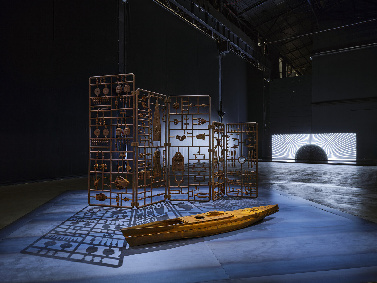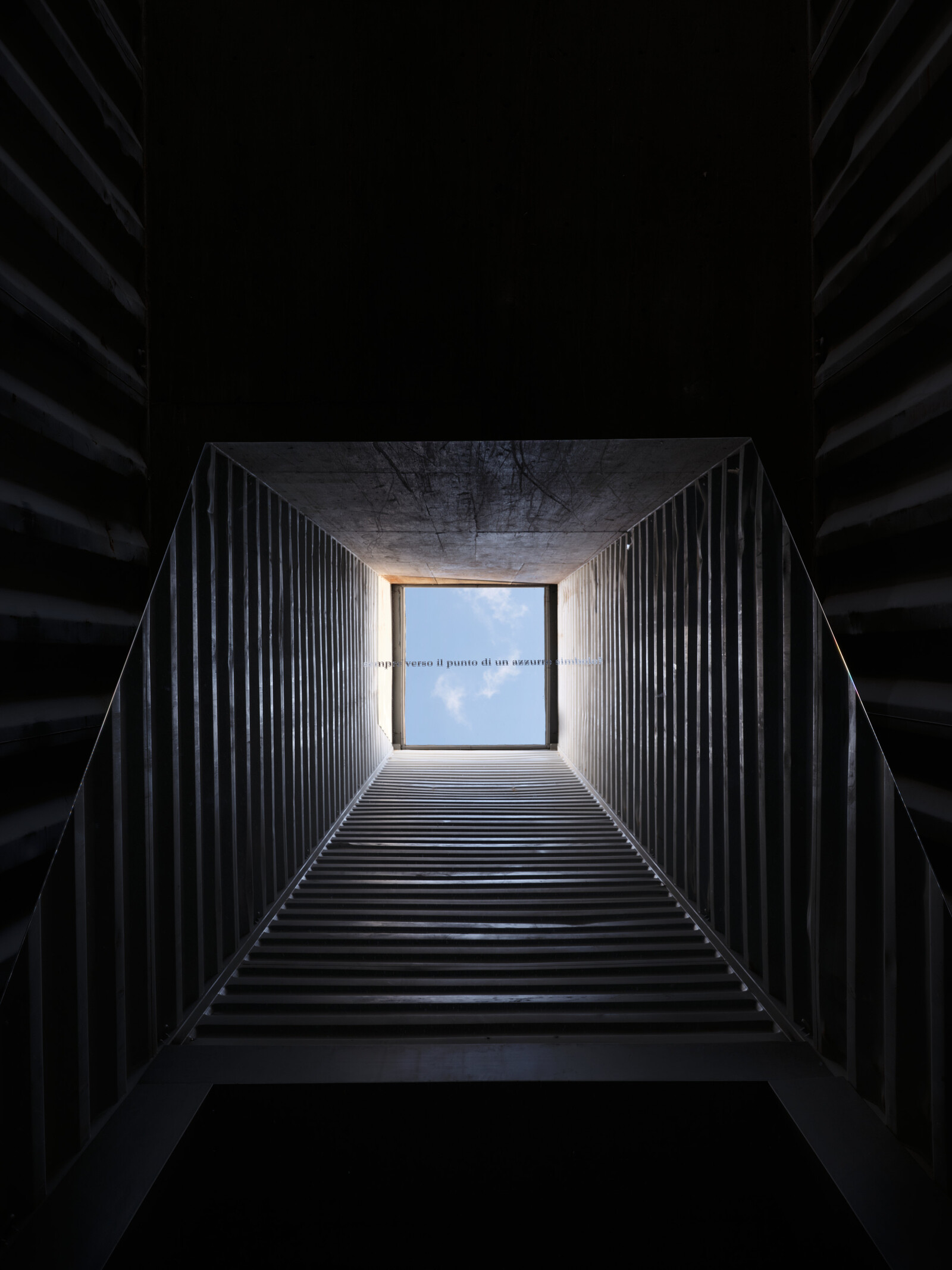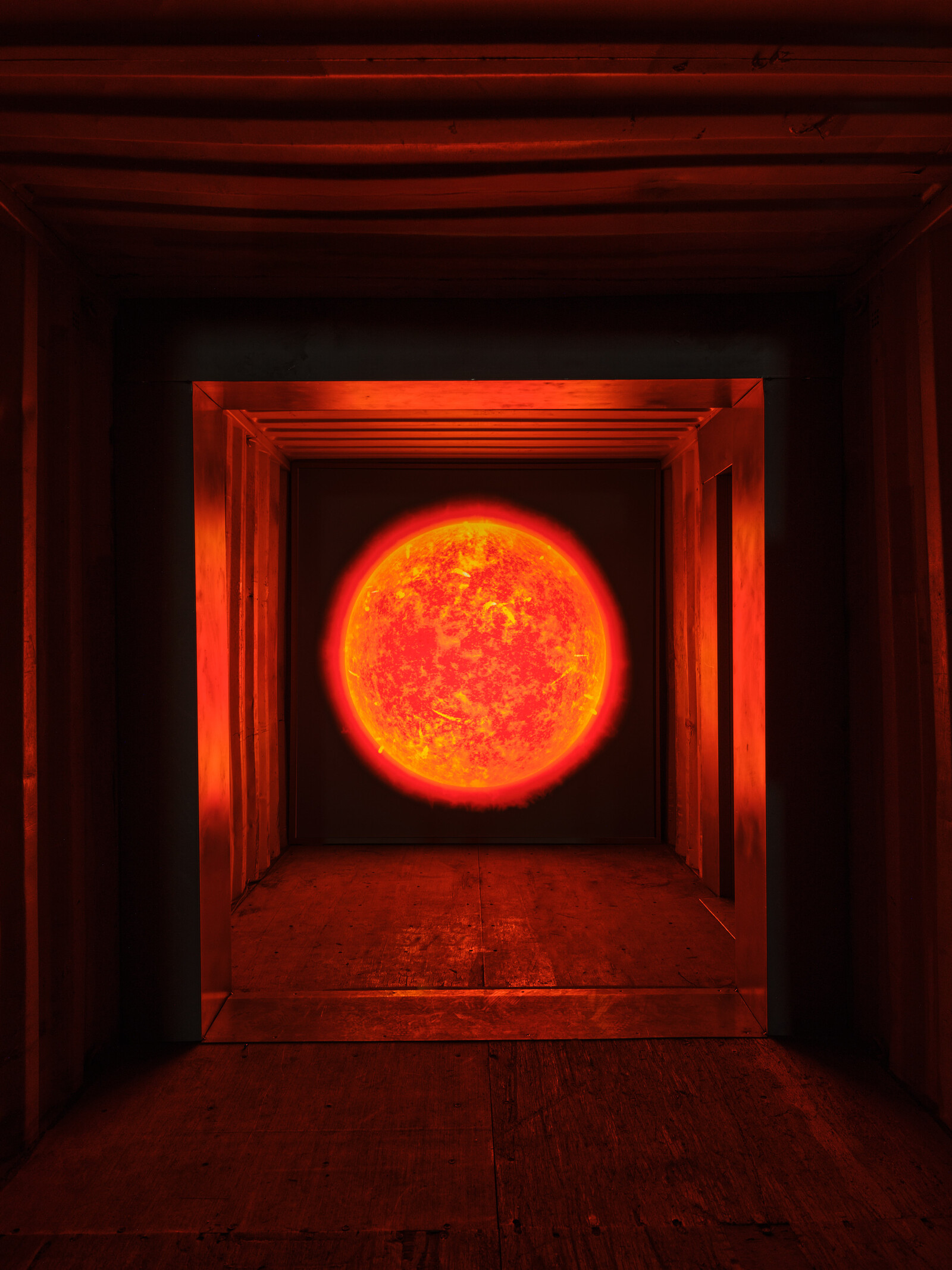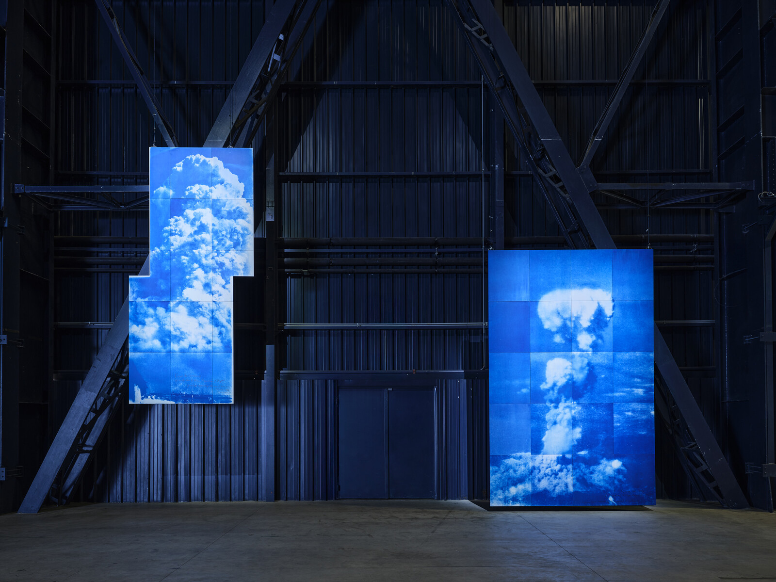 The central space of the Navate is filled by the monumental labyrinth of Icarus Container 2025 (2025), composed of several container modules and connected to a tower positioned outside the building, allowing natural light to enter. Visitors can walk through this maze, where they encounter verses from the renowned poet Yukio Mishima’s poem “Icarus”—taken from his autobiographical essay “Sun and Steel” (1968)—engraved on mirrors that create a constant play of reflections. Icarus Container dialogues with a selection of works that deal with nuclear energy such as Absolute Dud, 2016 and two new pieces made especially for the show that depict respectivley the mushroom clouds of the Hiroshima explosion of 1945 and the nuclear test that took place in the Bikini atoll in 1946.