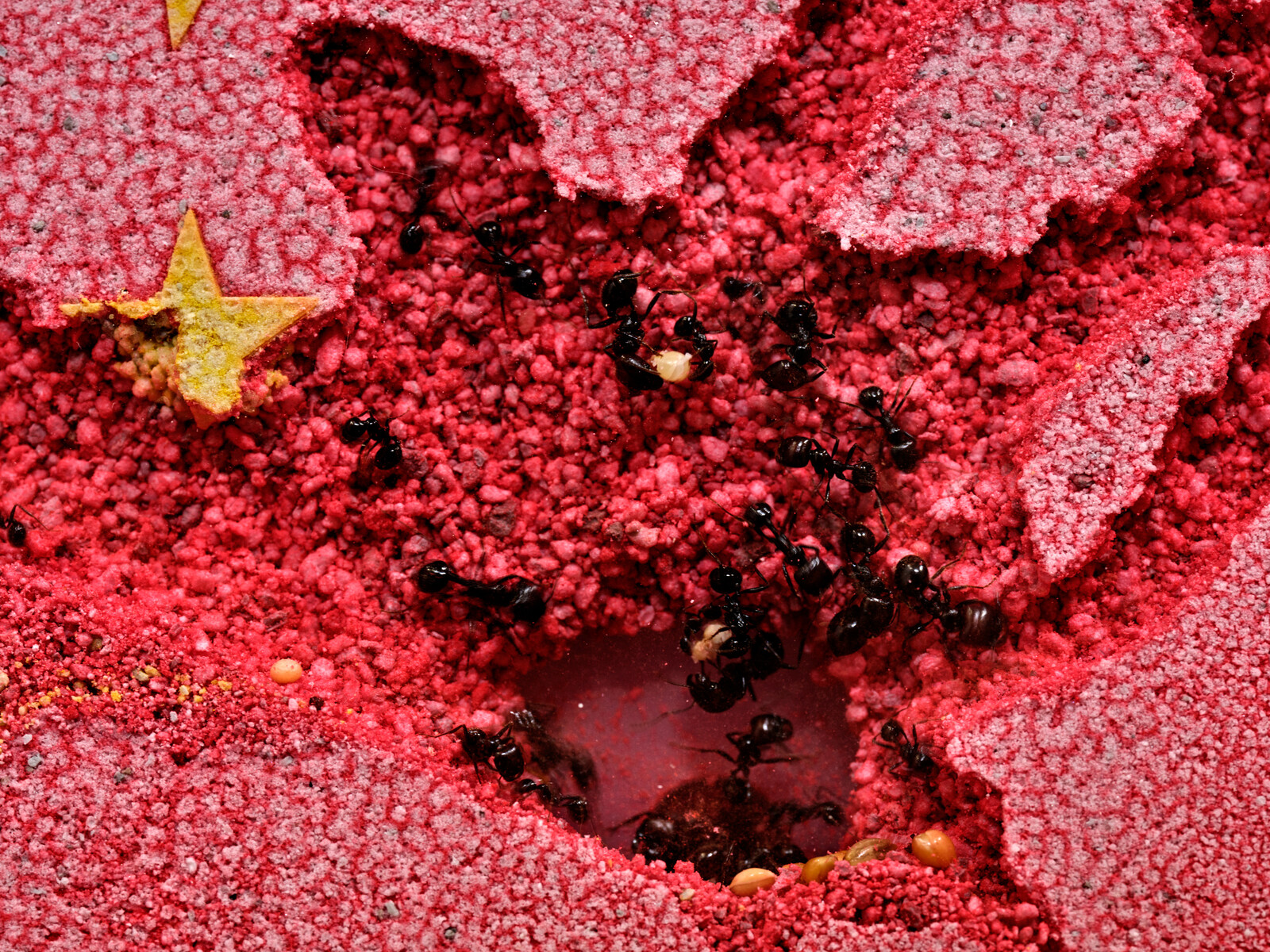 Finally, the Cubo also hosts the well-known work The World Flag Ant Farm 2025 (2025), which received international recognition when it was awarded the “Aperto 93” prize at the 45th Venice Biennale. The work is composed of two hundred flags made of colored sand placed in transparent Plexiglas boxes that are connected by plastic tubes. Thousands of ants, placed inside, create paths by carrying grains of sand from one box to another, slowly dissolving the borders and the flags themselves as symbols of national identity.