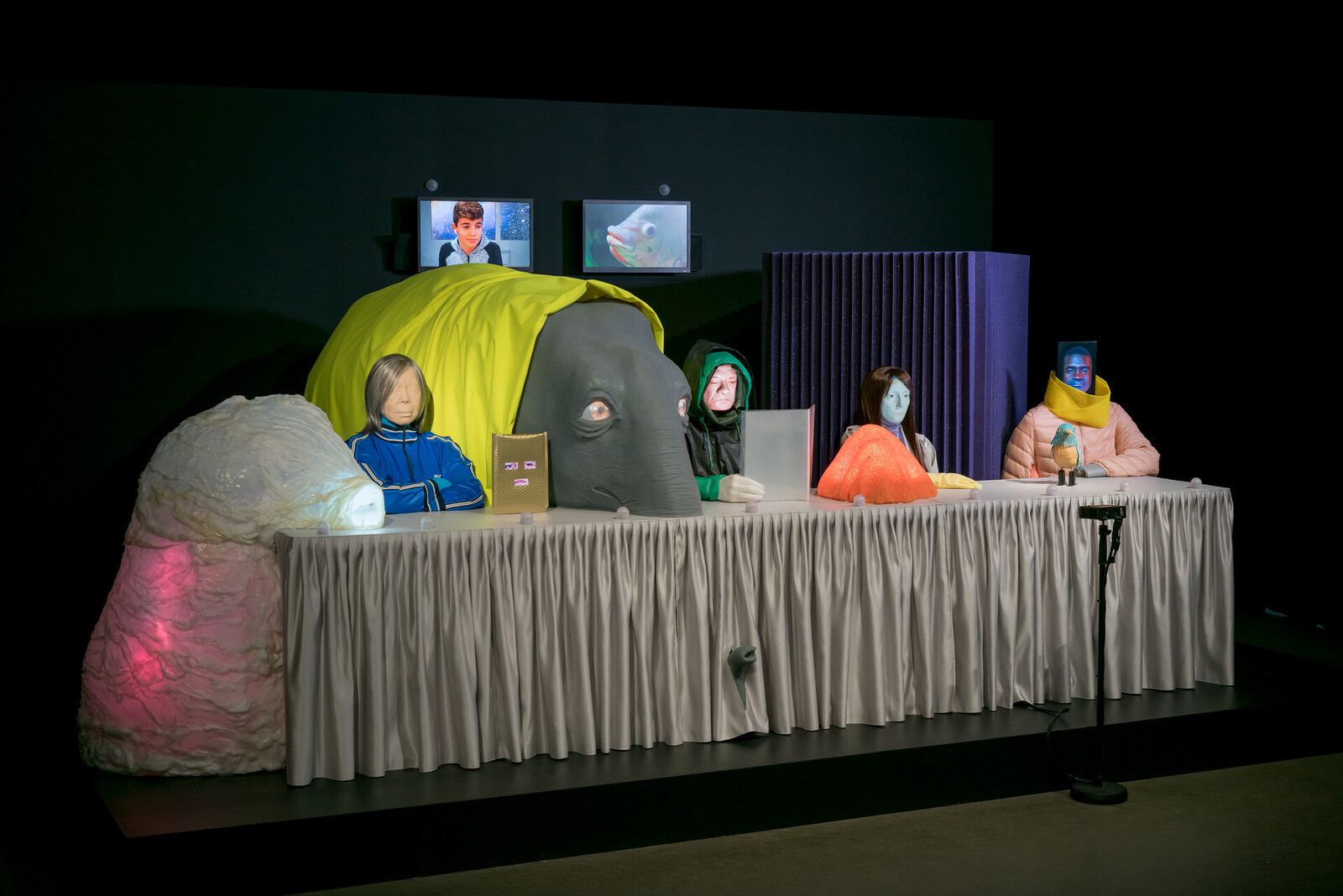 The exhibition extends in a winding labyrinth across Amos Rex’s subterranean spaces in Helsinki, Finland, with scales and distances varying from one work to the next, while the shifting angle of view activates our different senses. The combination of sculpture, moving image, sound and electronics creates a dynamic experience in which each installation takes us on a journey towards multiform understandings and insights.