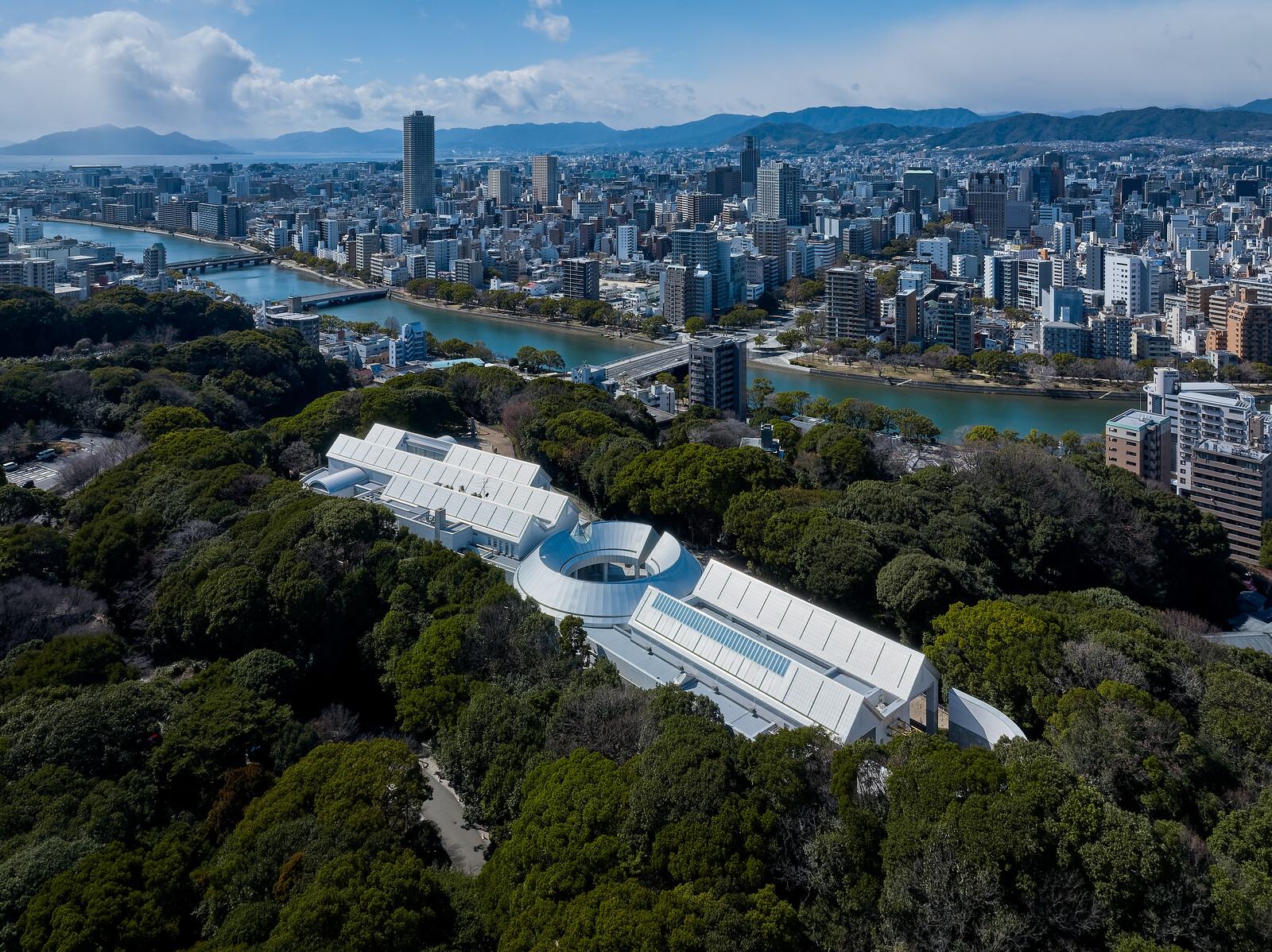 Opened on May 3, 1989, the Hiroshima City Museum of Contemporary Art is the first public art museum to devote exclusively to contemporary art in the whole of Japan. It is situated amid the rich greenery of the Hijiyama park, commanding sweeping views over the city. The museum building is of design by the architect Kisho Kurokawa. While blending the building harmoniously with the nature of the museum, and the building’s materials change as one moves upward through it, from natural stone, through tiles, to aluminum, created by humans, representing the unfolding of civilization out of the past into the future, and the flow of time, as well as Kurokawa’s unique philosophy of symbiosis.