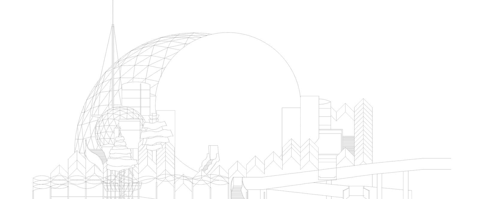 The desire to “not be bound by preconceived notions of what an architect should be” marks Hasegawa’s departure from the narrative projections of Shinohara as well as from the probing idealization of Taki. One of the earliest examples of this departure arises in Hasegawa’s design for the Shonandai Cultural Center. Taking up a full city block in Fujisawa City, the project boasts a planimetric abundance of forms and juxtapositions: sinuous lines of circulation move around a gridded plaza broken by a jagged artificial stream. A monumental sphere partially sunk at the northern end of the complex holds a cavernous theater and performance space, while a second sphere just to its south floats above the central plaza, a globe emblazoned with a map of the world on its metal exterior. A continuous collection of peaked square tubes bundle together along the perimeter like a palisade, a stark contrast to the variety of flows and forms contained within. When collapsed in elevation, architectural forms and textures overlap and interpenetrate like on a city skyline; juxtaposition and coincidence manifest the ad-hoc at the urban scale, condensed into a single architectural complex yet still monumental.