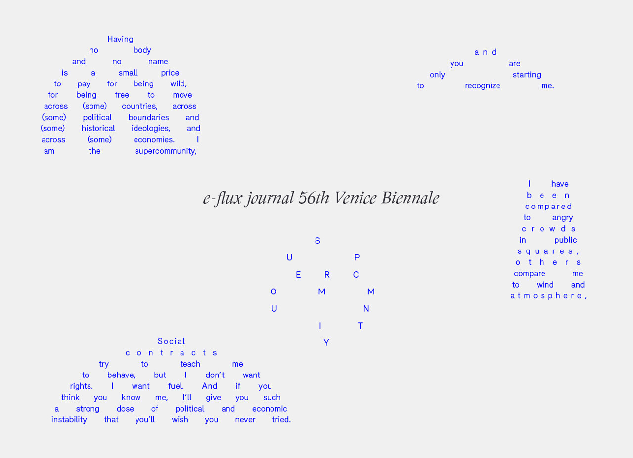 For their contribution to All The World’s Futures—the 56th International Art Exhibition: La Biennale di Venezia, the editors of e-flux journal created a single issue spanning from May to September 2015, with one piece of writing released each day.