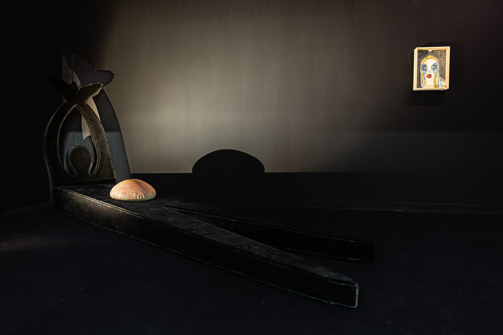 Several drawings and paintings, as well as one sculpture (a small head mounted on a tripod), have been grouped together in one gallery that has been plunged into darkness. Cinzia Ruggeri’s (1942-2019) pieces oscillate joyfully and humorously across “disciplines” (art, design, fashion) and refuse all categorization, to better play with their own porosity.