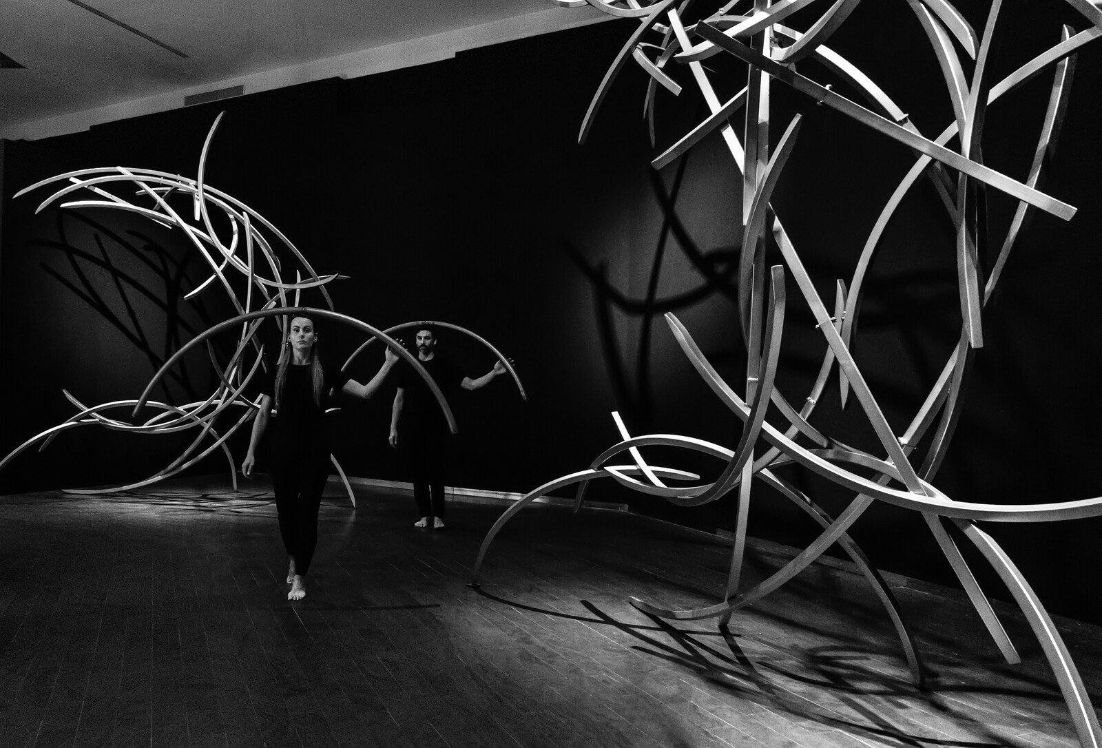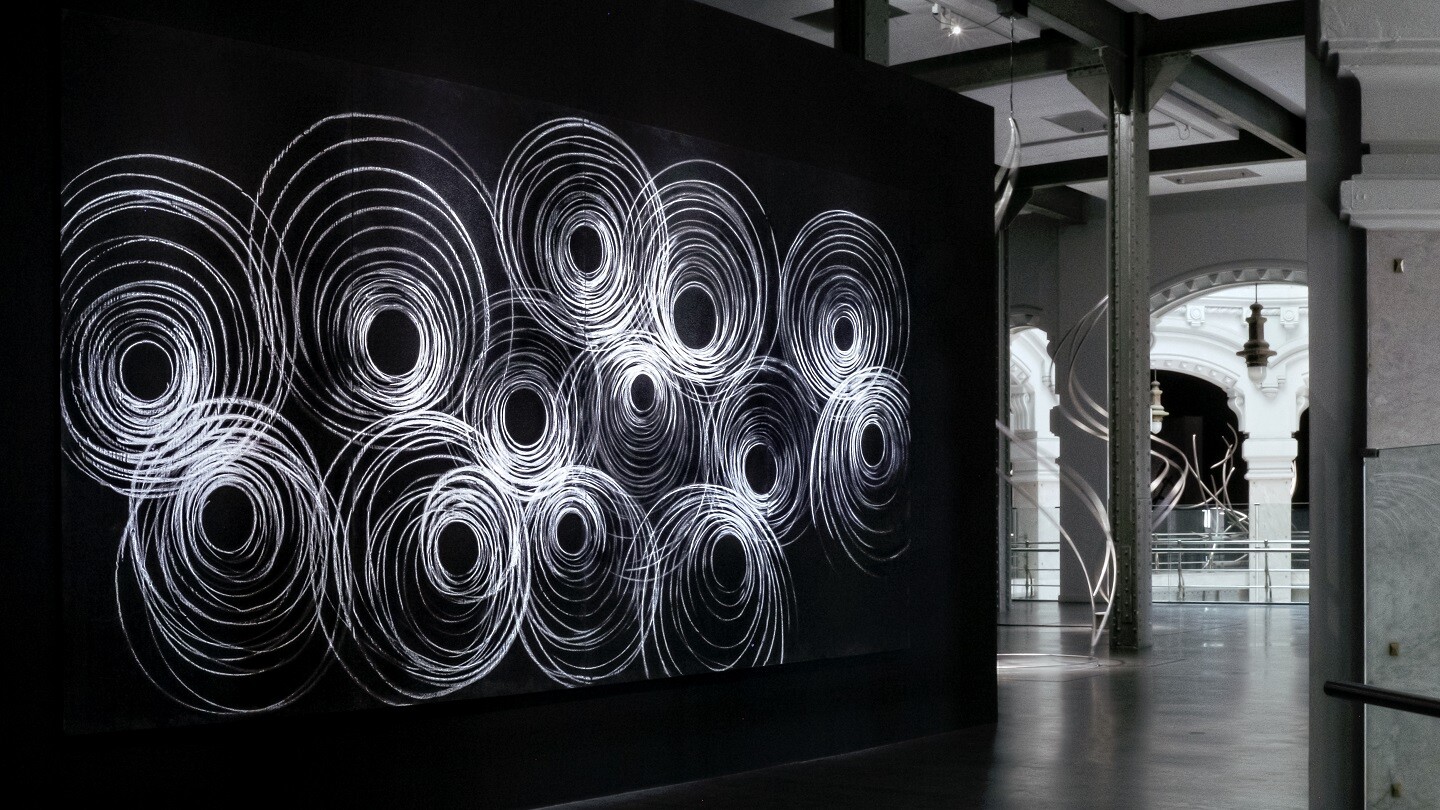 Madrid–born artist Mar Solís (Madrid, 1967) presents a large-scale installation designed in dialogue with CentroCentro’s monumental architecture, made up of more than twenty sculptures and drawings that create a three-dimensional triptych in the gallery. They all share a genuinely sensory and abstract language, in which opposing concepts are entwined: symmetry and asymmetry, attraction and expansion, light and darkness, matter and antimatter, and a time in which present, past and future converge in the same temporal space. Origin alludes to Mar Solís’ fervent interest in science and particularly in modern physics and its intersection with art as a tool for proposing new ways of perception. The exhibition is activated through performances in which the human body, metal and chalk complete the intention of its proposal.