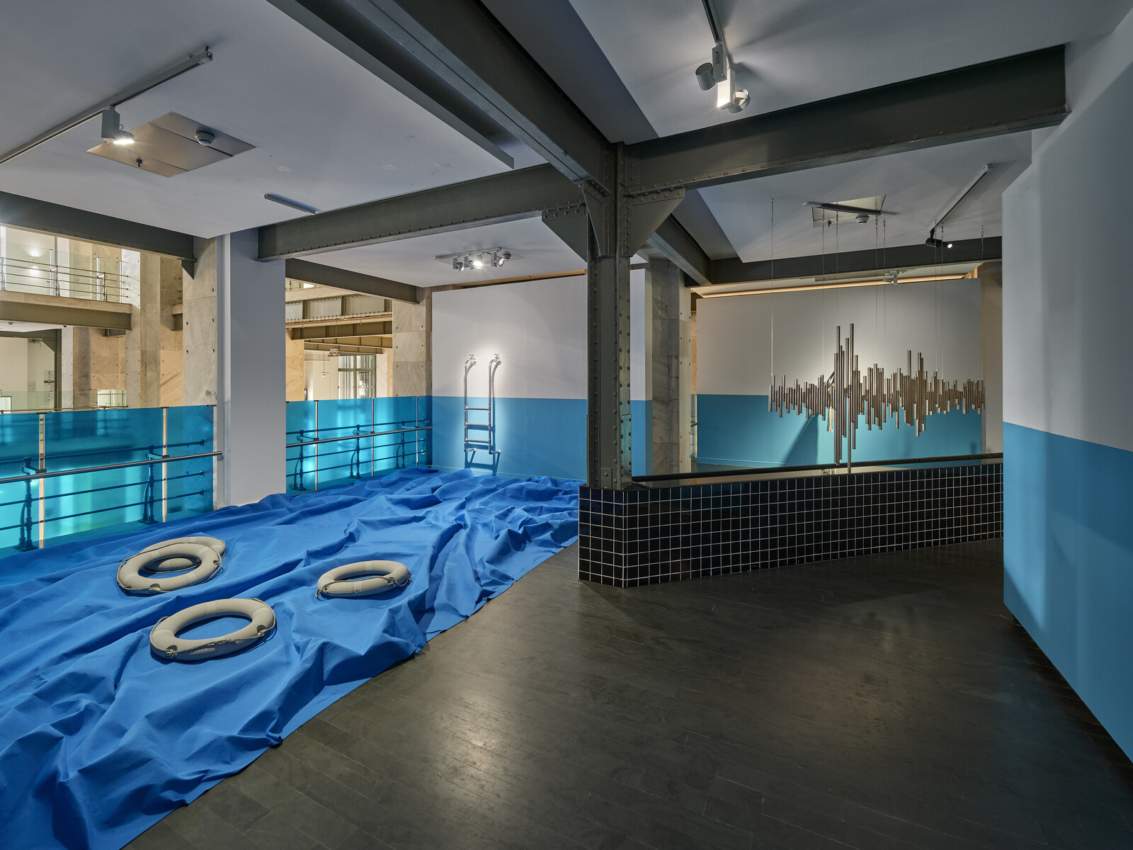 Almudena Lobera’s (Madrid, 1984) most significant institutional exhibition in Madrid to date presents one of her most haunting site-specific works. It unfolds as a continuous journey through an almost symmetrical space, where subtle dissonances within captivating installations evoke a sense of déjà vu in the viewer. Lobera’s sensory intervention transforms the space through color, conjuring the sensation of a swimming pool where the water rises to the viewer’s neck. Through new drawings, sculptures, installations, and video works, she reveals an iconography rooted in her exploration of perception and the creative process, offering an experience where the rational merges with the intangible.