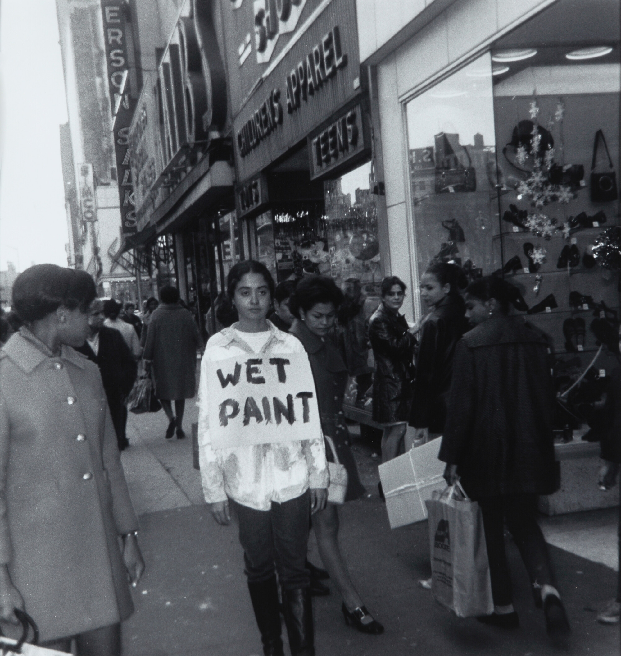 In contrast to this new category “wet,” we refer to classically defined Conceptual art as “dry.” Dry Conceptual art emerged in the midst of the incorporation of Fordist industrial production in the 1960s and was a reaction against the massification of commercial objects it produced. It was characterized as being indexical, dry, nihilistic, and text-based. Wet Conceptual was also non-representational but additionally emotional, colorful, performative, fluid, poetic, funny, personal, material, feminist, afro-futurist, planetary, posthuman and, yes, sometimes painterly. For example, Adrian Piper’s Catalysis III from 1970, in which she was photographed walking through the streets of New York City wearing a “WET PAINT” sign, seemed an anomaly. Bas Jan Ader’s Primary Time (1974), a performance piece that focuses on the simple act of eating, Martha Rosler’s Semiotics of the Kitchen (1975), as well as notable works by artists of Black Arts Movement such as David Hammons’s Spade (Power of Spade) (1969), in which his grease-smeared face and body were used to create life-size body prints, seemed oddly out of place in the context of works by the founders of Dry Conceptualism such as Joseph Kosuth and Sol Lewitt. As Mary Kelly stated in her retrospective analysis of Conceptual art at the National Gallery of Art Talks in 2002, “the analytic (dry) proposition of Kosuth needs to shift to a synthetic (flowing) mode which examines and interrogates the messiness of life itself.” Although appearing slightly later than the heyday of Dry Conceptual art between 1965 and 1972, Kelly’s Post-Partum Document (1973) combines stained diaper linings with psychoanalytic contrived markings all enclosed in Perspex and provides one poignant example.