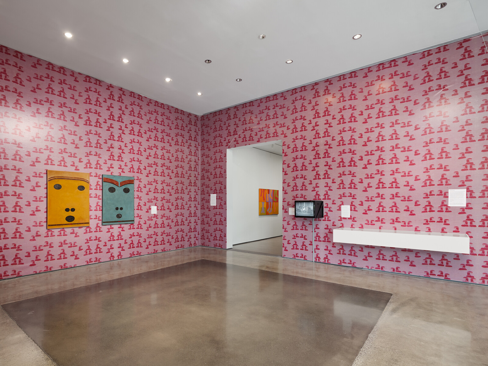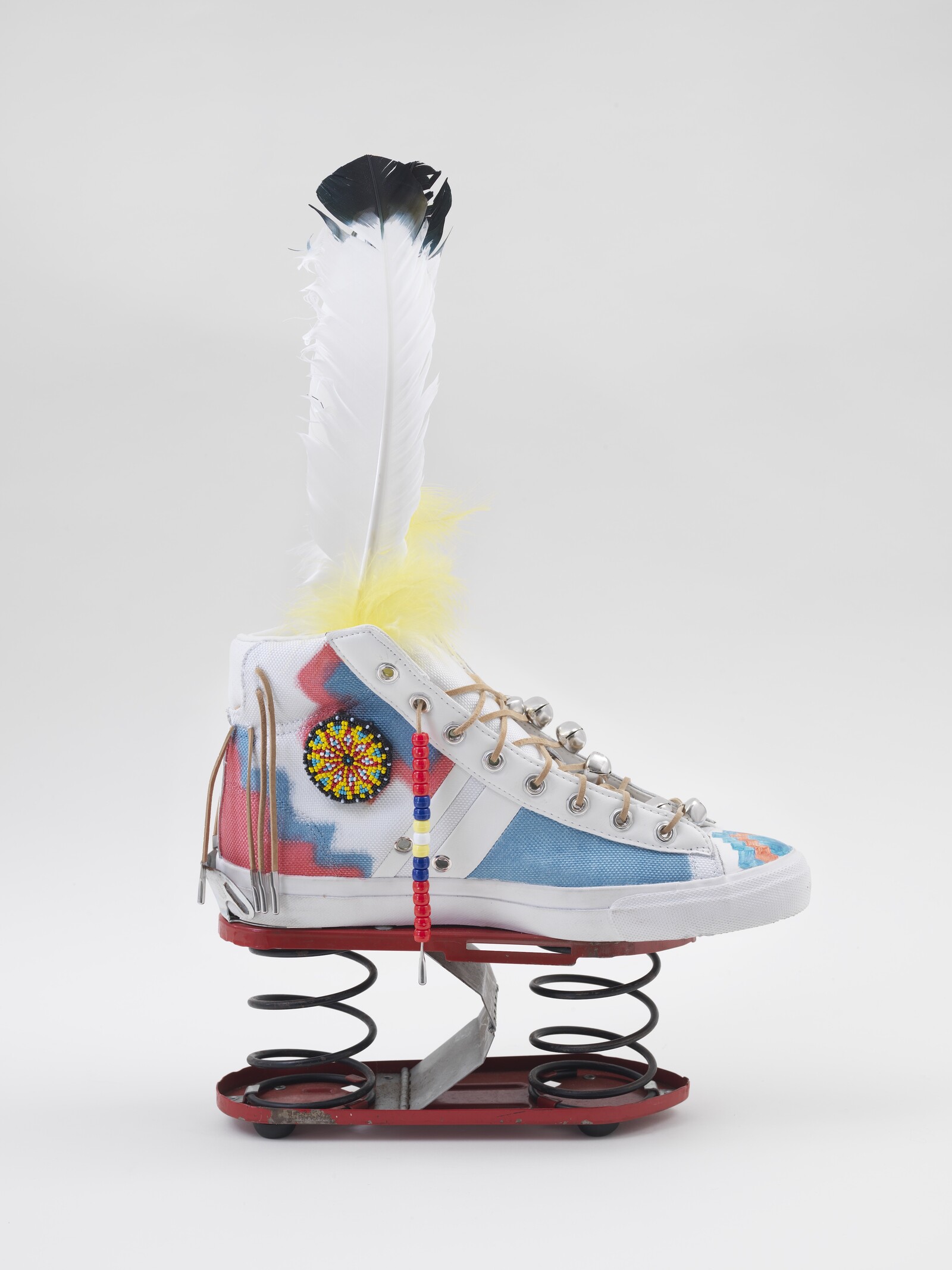 For millennia, Native artistic expression has been sewn into the activities and objects of everyday life, and while societies and cultural practices constantly change, the emphasis throughout “Indian Theater” on performance would seem to be a way of activating the works on display and not have them exist as static artworks fastened to a wall, plinth, or floor. Nearly all of the exhibition’s painted and sculptural works feature objects that are always in close proximity to a body: shirts, shoes, gloves, condoms, masks, earrings, etc. Bob Boyer (Métis) painted geometric Native designs on blankets, while Dyani White Hawk’s (Sičangu Lakota) conjoined abstract panels are inspired by Lakota beadwork and quillwork.