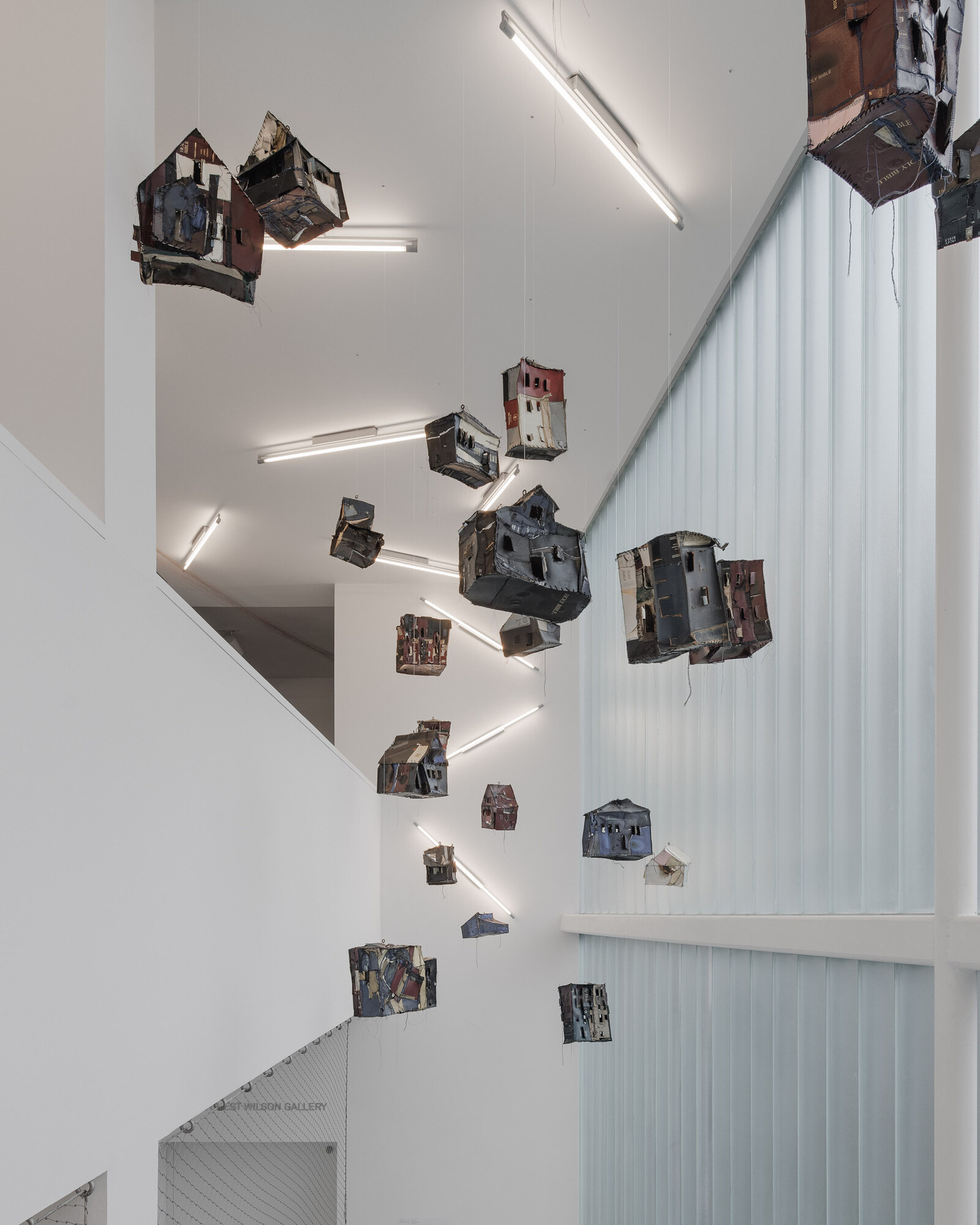 The show opens with model houses made from old Bible covers by Chiffon Thomas. Attached to the ceiling over the staircase to the exhibition floor, they hover like ghosts. Thomas was inspired by the neighborhoods of his Chicago childhood, but the shaky silhouettes of these model houses could be Houston’s Third Ward, or any poor community where a church promises a better life perspective than the current economy and policy.