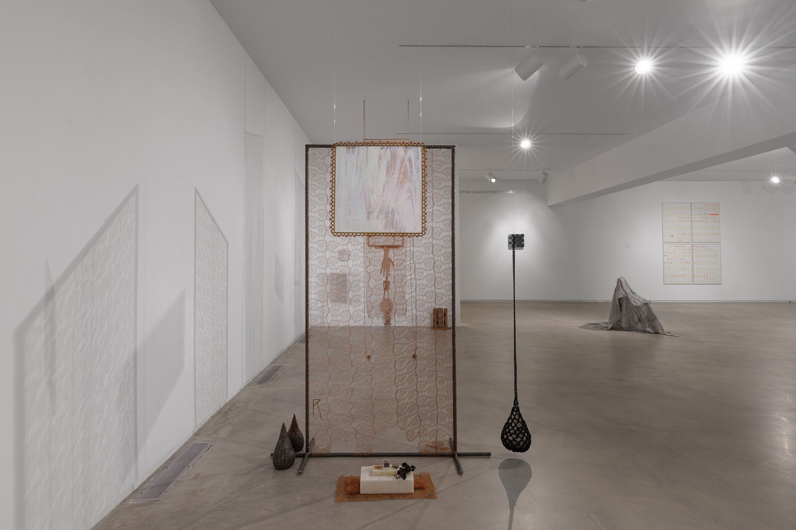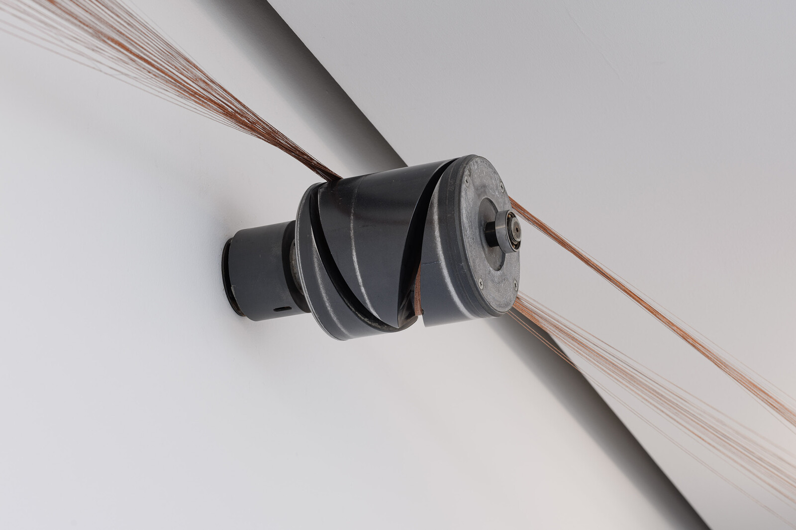 Finally, there are pieces that mock the mundane technicalities of the systems that surround us, accentuating the human touch. Gwenneth Boelens’s This Dusk Song (subtle body) transmits copper wire and reflective yarn through the upper parts of the exhibition space’s walls with spindles, rollers, and pulleys reclaimed from an abandoned textile factory. This apparatus’s activity is a mere metaphor—unlike Kate Newby’s series of Texas-made cast-iron grates installed at different drainage locations around the museum. Regardless of their functionality, these pieces feel closest to the curator’s position as the engineer of this narrative.