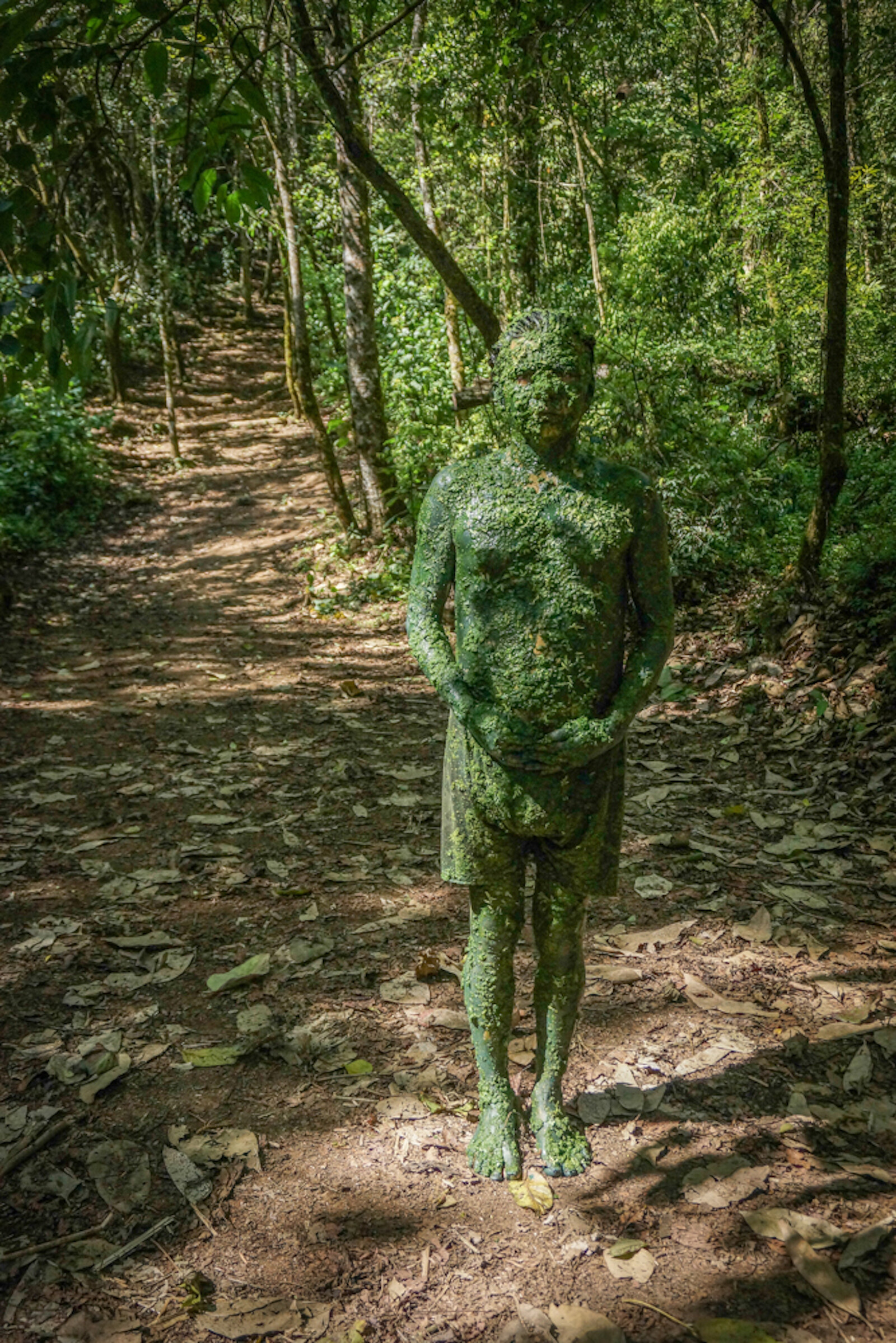 Objects that the museum infrastructure is supposed to protect and maintain again subvert the logic of the show. In works by Lonnie Holley, ektor garcia, and Benvenuto Chavajay Ixtetelá, the artists reference alternative, pre-railroad forms of connection. Holley’s The Skin That We Are Deeply Wrapped Within (2021) is a quilt with floating female profiles spray-painted over it. Guatemala-born Benvenuto Chavajay Ixtetelá is represented by a photograph of his performance in the sacred mountains of his native country, his body covered in leafage to signify an ascent to the state of “plant humanity.” Traditional Mexican doily-making informs the delicate copper screens and objects by ektor garcia.