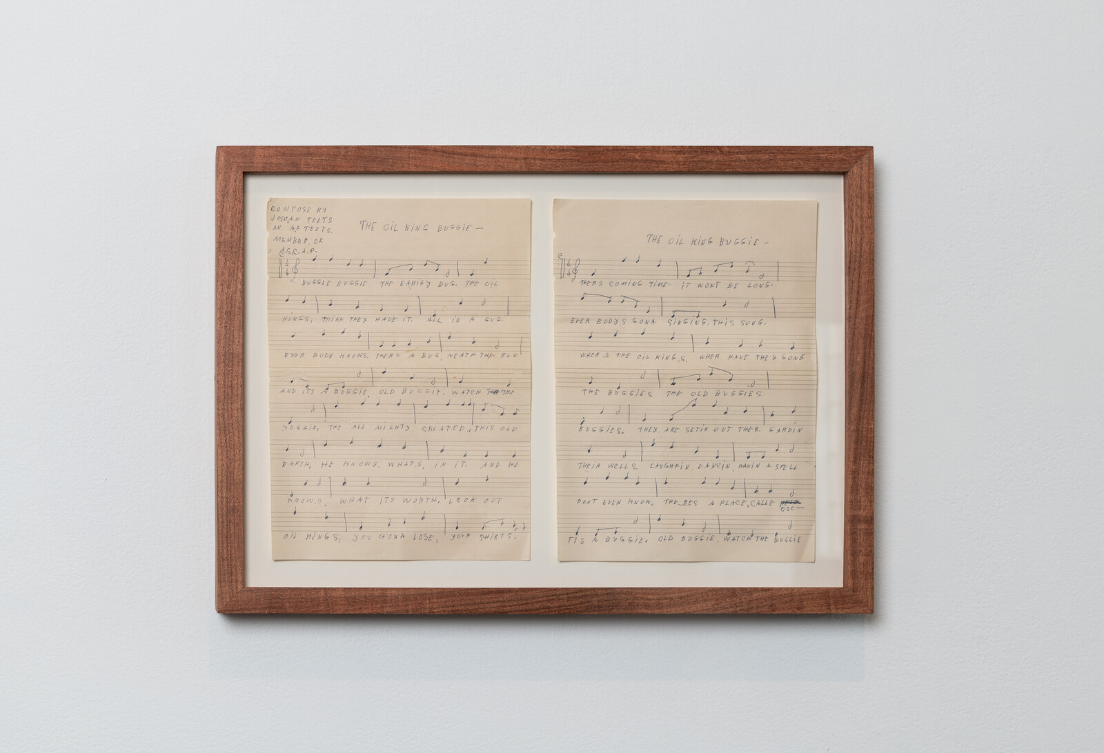 In a transgenerational dialogue the curator’s great-grandmother, Josie Ann Teets, an amateur songwriter, meets a young French artist. Josie Ann wrote and published The Oil King Buggie in 1975. The show contains a notation page, with words to the song curiously jumping under the lines, and spellings contorted to imitate a Texas accent. It’s a satirical take on the oil entrepreneurs’ hustle, reminding them that only the “all mighty” knows what’s in the Earth that He created. Two pieces by Clémence de La Tour du Pin, installed directly opposite the song, were made specifically for the exhibition. In the first, Arrangement VII: Der Parasit (all works 2023 unless otherwise stated), a mock-up of the German-language version of Michel Serres’s titular 1980 book, is displayed alongside archive photographs of Houston’s oil industry and the artist’s personal effects. The second, Arrangement IX: Peculiar Sweet Matter, presents a selection of beeswax casts of perfume bottles in petroleum black; they emit an agreeable odor evident only after leaning in to read the work’s label.