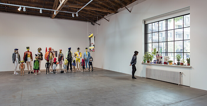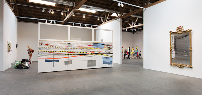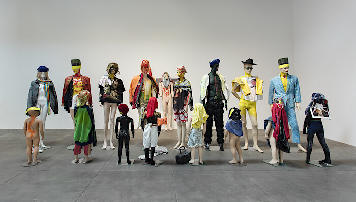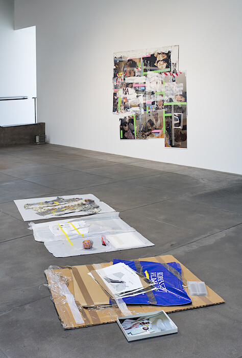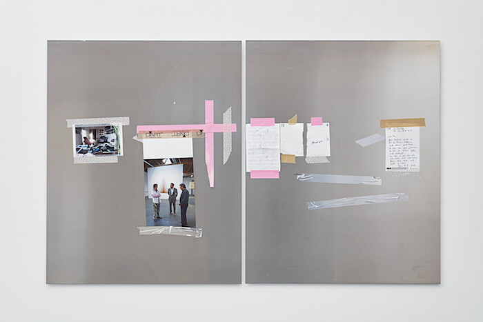 This much is routine for globalized economies. Meanwhile, under the flag of Hauser Wirth & Schimmel, commodities sail toward higher tiers; product leaves a workshop in Berlin for an L.A. boutique. Genzken’s intervention in said stuff serves as authentication—as if to de-abstract stuff’s spasmodic “flows.” A collage of pink and spotted adhesive tapes on two aluminum panels includes a recent photo of Genzken chatting with titular gallery partners Paul Schimmel and Iwan Wirth during the gallery’s inaugural show; behind them, on a wall now given over to Genzken, hangs an untitled work by Marisa Merz. As if more proof were needed: “Genzken was here.” Pastiched phrases like “SIENCE FICKTION” and “FUCK OUI” headline scrappy material pile-ons—glossy lines of tape or sprays of torn currency, a printout of Caravaggio’s Boy Bitten by a Lizard (1596). Art and pop and empire intertwine into a formalism of correspondence. One in a lineup of mannequins, titled Schauspieler (Actors), wears a t-shirt in memory of Michael Jackson, who died three years before Michael Asher. In the tribute to one Michael, Genzken points to the mass-market mourning for another.