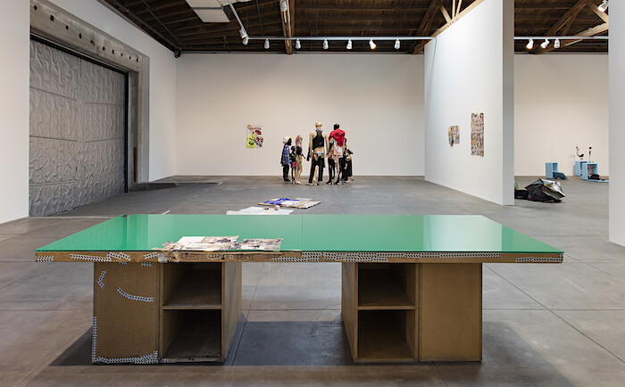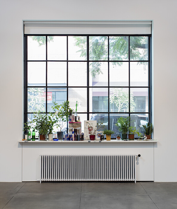In a shallow bay window facing 2nd St., a ledge overflows with studio clutter: a couple dozen euros in coins between a few dying plants; a bowl filled with loose earrings and studs; a keycard from the Waldorf Astoria; a castle of used tea candles, Red Bull cans, and tiny uniformed figurines (cops, or Luftwaffe), all iced with white paint. One only wants the empty blue ashtray to overflow with butts to complete the quintessential image of an artist at work. The setup doesn’t just mimic; nearly every object has been shipped from Genzken’s studio in Berlin, down to the ledge itself. The extant window has been remodeled and a radiator sourced to match the original. (Genzken’s actual desk is here, too. So is a reproduction of a studio wall.) Her process has seemingly been frozen, portioned into discrete pieces, and mailed to L.A.