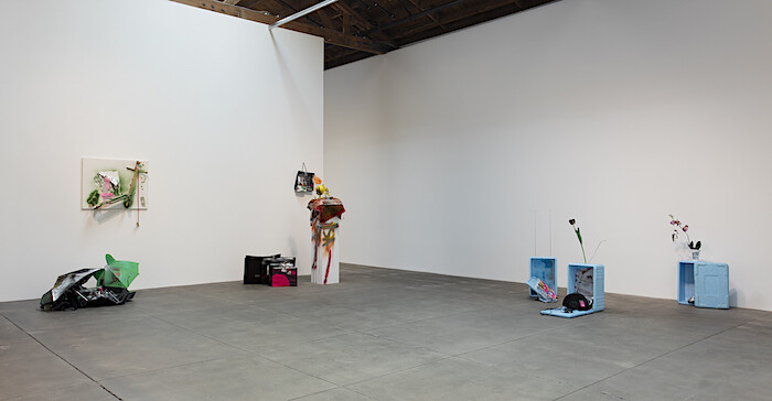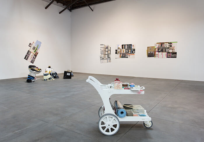 The collages and assemblages, accordingly, are laced with the leftovers of art handling, packing and unpacking; one trio of works is laid out on their boxes; several pieces include tape marked with the D’ART® logo of a transatlantic shipping company. (All works are from 2016 and, except where noted, untitled.) Other sculptures feature German shopping bags. An English-language “Open” sign is powered via European-standard plug and adapter. “I Love Michael Asher” presents the assembled expressiveness of Genzken’s work as “imported”: insisting that all of these clothes, toys, umbrellas, styrofoam coolers, clock radios, adhesives and wires and pigments—all of this stuff—has physically crossed at least one ocean, probably two.