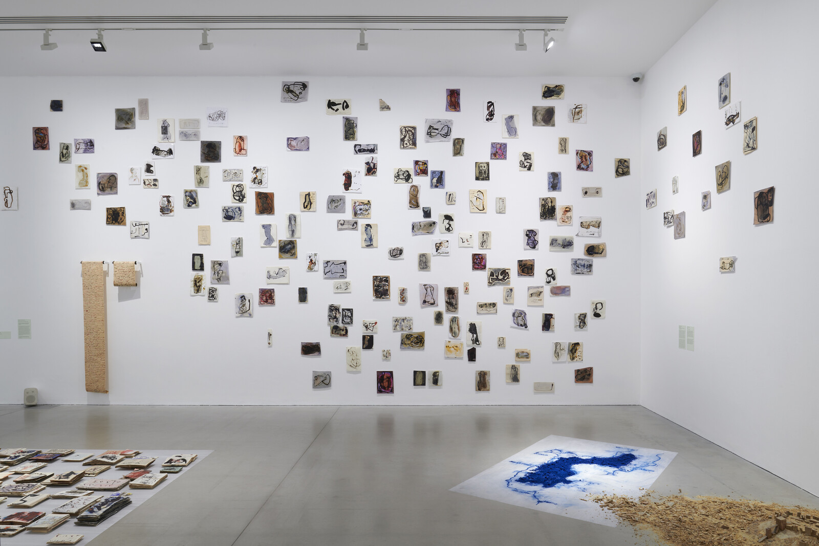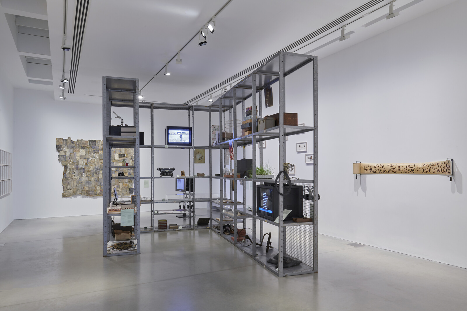 Inspired by prisoners who smuggled their names out of a Syrian jail to let their families know they were alive, Urgent Archives, written in blood (2019) consists of disbound books and papers—perhaps the dead stock of an antiquarian bookshop or college library—loosely gridded on the floor, some “hovering” on blocks. In black, blue, and blood-red ink, Kourbaj has marked them with erratic lines and handwritten Arabic script. One book is stamped with the (English) words LEAVE TO REMAIN, signifying a refugee’s permission to stay in the UK—the granting of which is unguaranteed, racially biased, and often long-awaited in one of the country’s prisonlike detention centers.