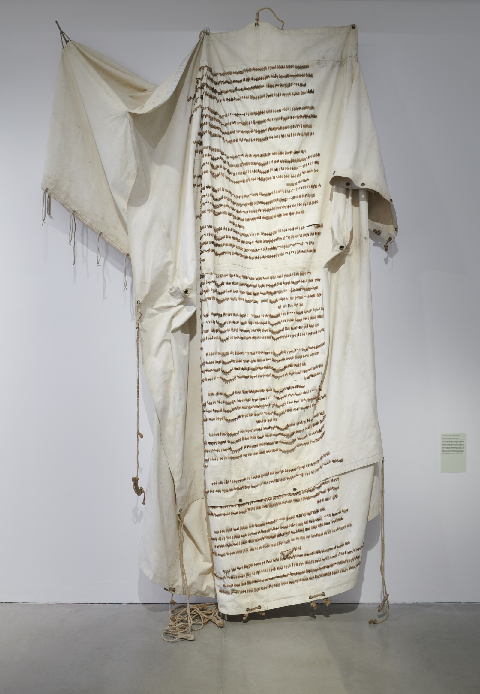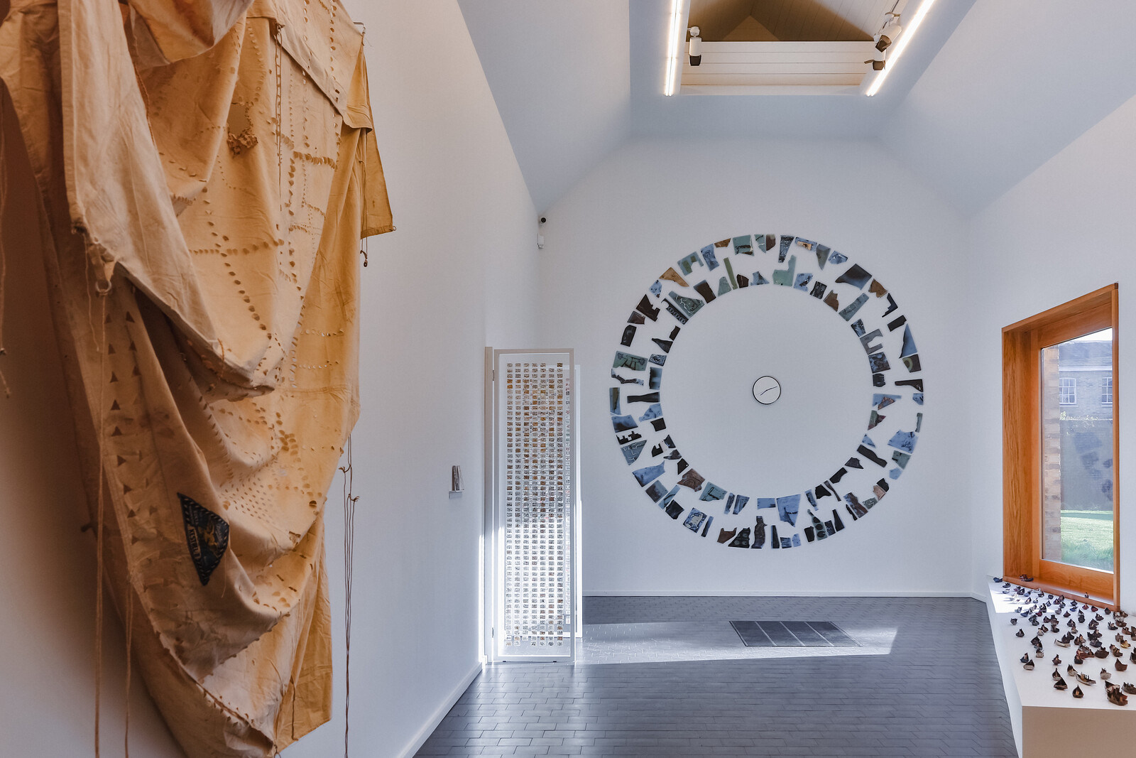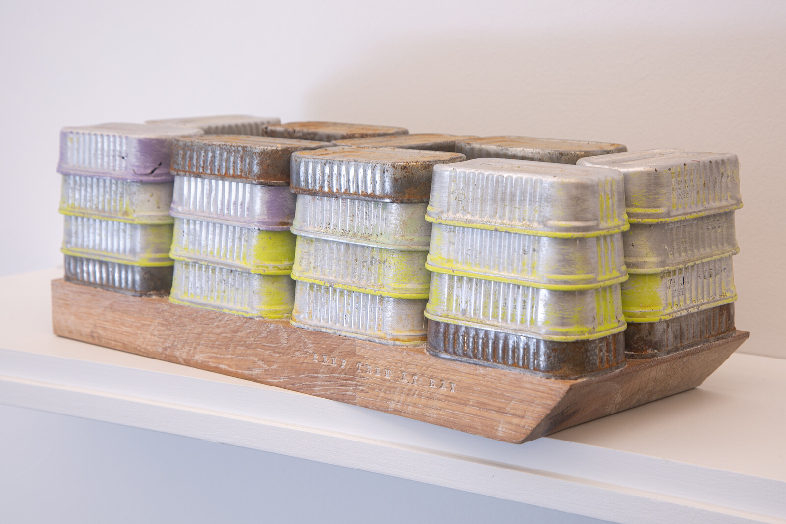 Kourbaj’s found poem Leave to Remain: A single Syrian grain airborne (2020) threads through his exhibition at Cambridge University’s Heong Gallery, which engages with the UK’s increasingly hard border. The poem’s call-and-response—in which the oxymoronic term “leave to remain” meets rejoinders such as “lifeless” or “Aleppo devastated”—is embossed into a lead lifejacket (The Sky is Sinking, 2023) or handwritten, in Arabic and English, on the backs of postage stamps. An affecting representation of the notorious Bibby Stockholm—a disease-ridden, deliberately dehumanizing migrant detainment barge moored off the country’s southern coast—Keep Them at Bay (2023) is composed of sardine tins on a wooden base, the corner of which juts off its shelf to draw attention to the engraved words of its title.