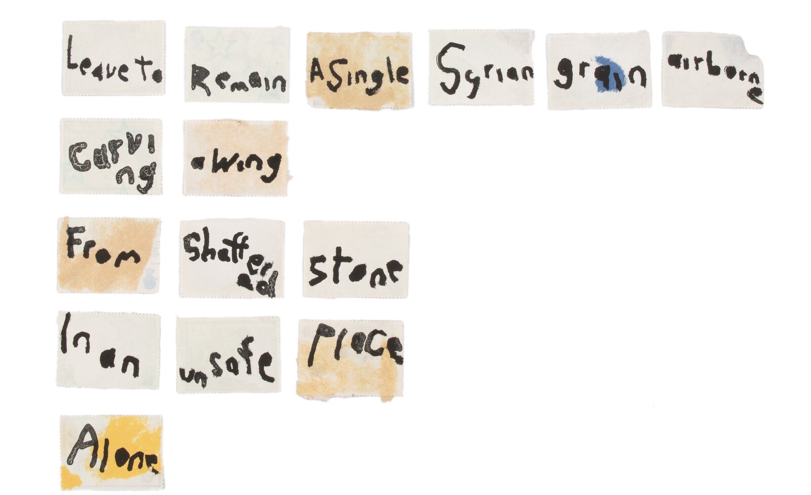 Every day since the uprising, Kourbaj has sewn a date stone into a tent fabric to create Our exile grows a day longer and a day closer is our return (2024), craggily pinned to the wall and resembling a ritual megalith. A vitrine presents volcanic rocks from his hometown of Suweida, reassuring in their endurance and as topographical relics conflating “here and elsewhere”.1 Showing on a monitor is a video document of the contrastingly ephemeral performance Imploded, Burnt, Turned to Ash (2021), in which Kourbaj memorialized the tenth anniversary of the uprising by scrawling a poem on a large sheet of paper, which he then tore up and burned. Packets of Syrian wheat seeds, samples of which have sprouted from a plastic tray, also participate in the measuring of time in objects, plants, marks, gestures, and geographies. The impression is that keeping track might fill the void.2