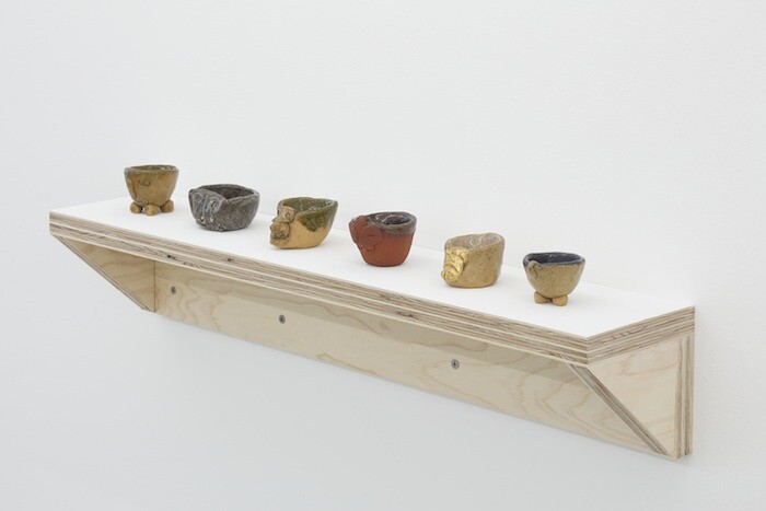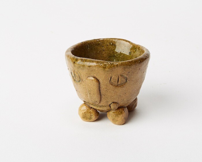 Pieces are arranged in roughly chronological order on waist-high, white wooden tables of the kind that might be used by an apprentice potter for wedging clay. These tables form a “T” shape in the center of the gallery. Hung pieces and other works that don’t fit the rhythm of the ceramics on the tables—including a 1990 series of small mezcal cups with faces—look on from the walls. Together they form an unorthodox array of modernist shapes, raw textures, and splotchy glazes that feels unburdened by tradition. The pieces are wide-ranging in their geographical origin, created between Okayama Prefecture and the home Blunk built in Marin County, Northern California.
