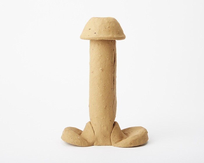 When Blunk returned to the United States in 1954 he focused his attention on the redwood sculptures, so there is little here from the 1960s and ’70s, just one cup from 1965 and an unusually ornate sculpture and candleholder from 1970. The next cluster of work dates from the 1980s and, rather than moving in a clear trajectory away from his traditional beginnings, Blunk oscillates between modernist abstraction, Mingei, and phallic symbols. Right in the center of the gallery is a small ceramic candleholder in the shape of an erect penis. At this point, Blunk has clearly begun to embrace a more unpredictable ceramic language.