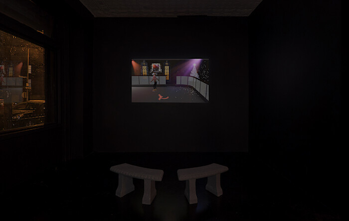 A source of artistic fascination since the nineteenth century, when it became the subject of the Hudson River School of landscape painters, the grandeur of Upstate New York’s Hudson Valley also figures in Jacky Connolly’s first solo exhibition, at Kimberly-Klark in Queens, New York. The exhibition’s centerpiece is a video projected against the wall of the darkened gallery—for the duration of the show, the gallery is only open during the evening. Entitled Hudson Valley Ruins (2016), the video, as with all of the artist’s, has been constructed entirely within the computer game The Sims 3 (2009). Named after a website that chronicles the region’s abandoned architectural landmarks, it is set in a virtualized Hudson Valley with an ambience that might best be described as rural-suburban Halloween macabre circa 2004. Hudson Valley Ruins’s opening sequence clearly situates its aesthetic coordinates—cartoonishly gothic red lettering displays the title over a shot, at dawn, of rolling hills, fall foliage and, in the foreground, a weather vane on the roof of a lone house. The wind whistles threateningly, a motif that persists throughout the video’s half hour. Then, it begins to rain.
