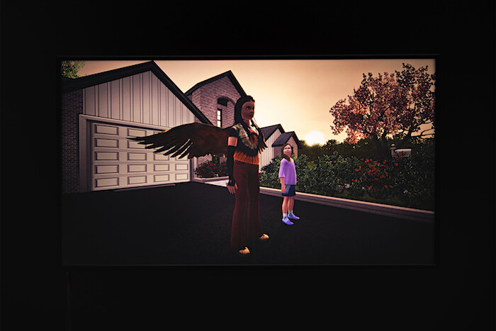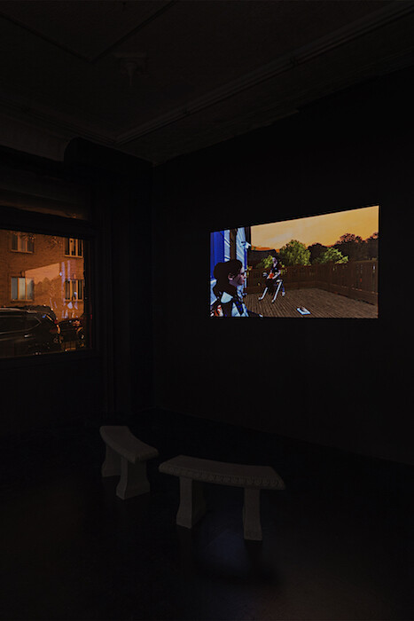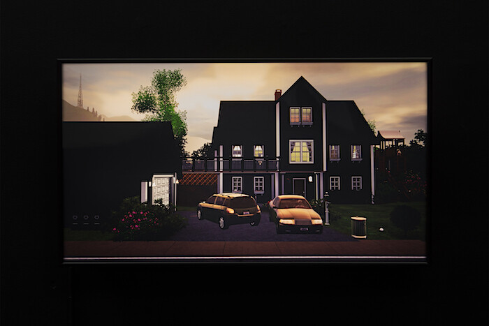 And yet a sense of collapse, or of never having had a solid foundation to begin with, is deeply inscribed on the built architecture of the video’s setting. Surreal juxtapositions abound in Connolly’s elaborately detailed interiors, which could be read as taking the consumer object fixation of The Sims to subversive excess, and feature oddities such as inexplicable Chagall paintings in a suburban living room and a pretzel-shaped bench on a front porch. Nothing, however, feels like a massive leap from the already highly elastic principles of postmodern suburban design. (This free-for-all wresting of signifiers from any historical mooring is cannily alluded to in an installation feature of the exhibition—two benches fabricated in the sort of faux-Greco-Roman style that is a ubiquitous feature of suburban non-places provide the gallery seating for the video.)