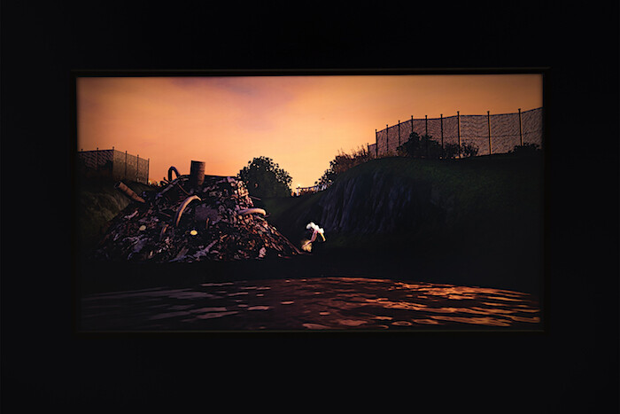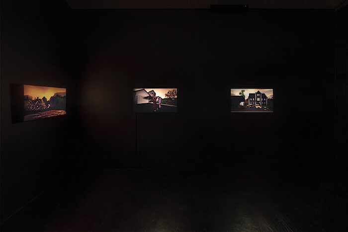 On its surface a story of suburban angst, the video speaks to the sometimes debilitating intractability of place and past against the escape promised by virtual life and the avatar. On the two walls opposing the projected video are three light boxes, (Majella (Dirty Fill); When The Wind Blows (The Adoption); and Strange Weather (The Divorce) (all 2016), depicting scenes from the world of Hudson Valley Ruins. While an unnecessary corollary to the show’s cinematic centerpiece, in recalling the backlit promotional movie posters often found at theaters, they remind that nostalgia most often serves to transform personal narrative into commodity.