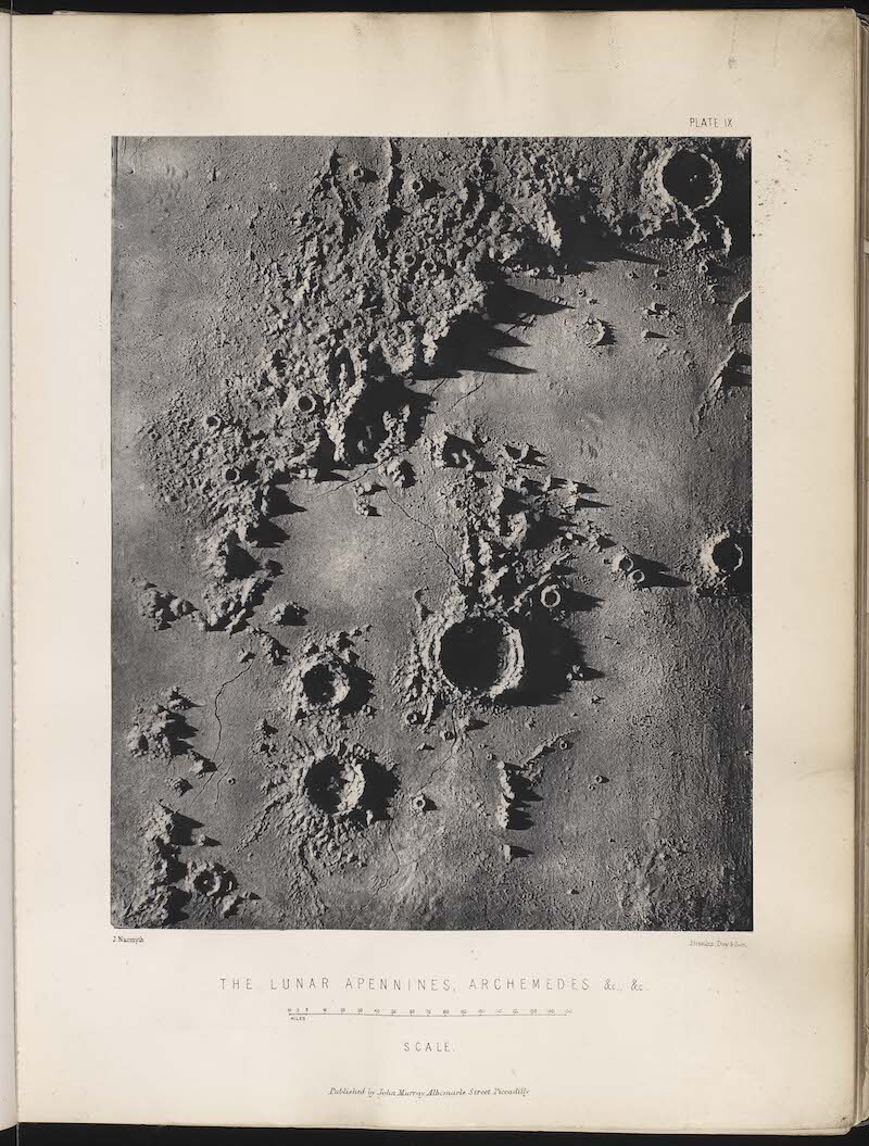 Two recent exhibitions exploring the moon’s magnetic allure are “Jacob’s Ladder” and “Astronomy Victorious,” a two-part display across Ingleby and the University of Edinburgh Main Library. Although the two shows ostensibly survey humanity’s broader relationship with the universe through a combination of contemporary artworks and rare books, the most compelling works share a lunar focus. The unofficial figurehead of both exhibitions is the nineteenth-century Scottish engineer and artist James Nasmyth. Both galleries display plates from Nasmyth’s 1874 book The Moon Considered as a Planet, a World, and a Satellite, which reveal the author’s deep curiosity and ingenuity in pursuit of the moon’s mysteries. Hindered by early photography’s technical limitations, Nasmyth was unable to take close-up photographs of the moon. Instead, he collaborated with astronomer James Carpenter to create and photograph a series of hand-made plaster models of its surface to illustrate his book. Nasmyth had an artist’s eye for arresting visual analogies and these topographic simulations are featured alongside images of a wrinkled hand and a withered apple used to illustrate his theory that the moon’s textured surface resulted from cooling ancient volcanoes.