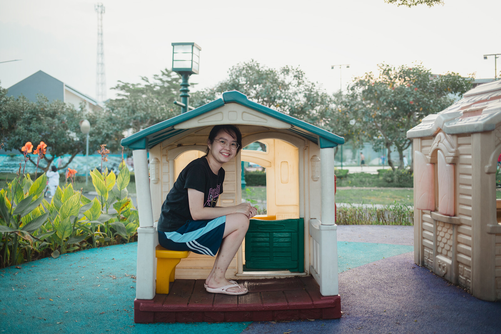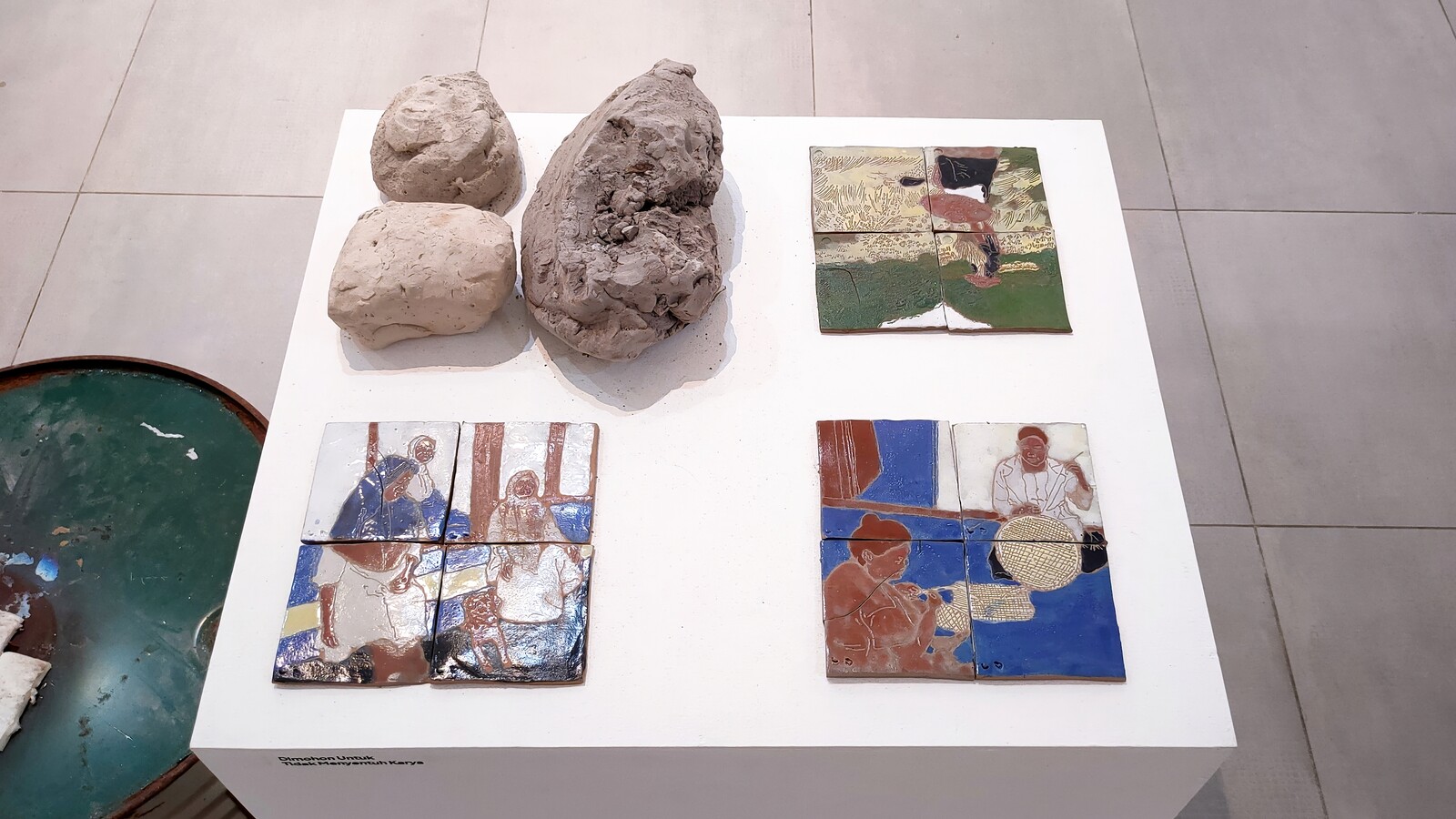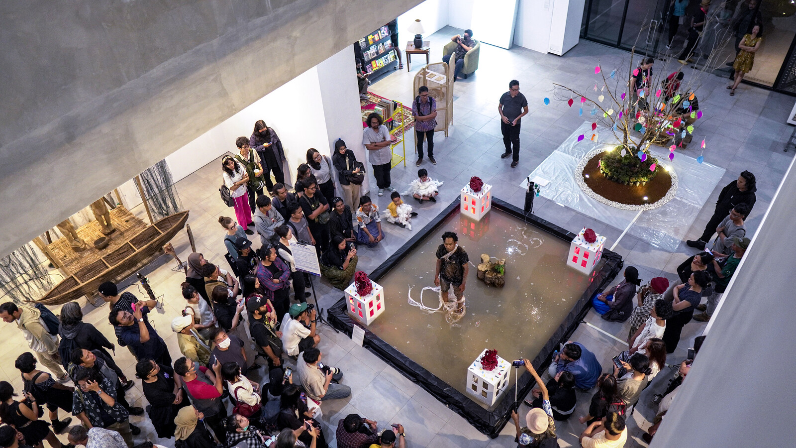 For all that the main exhibition suffers from a lack of cohesion, a number of rhymes and patterns emerge. In this fast-sinking metropolis, to make art is to always be conscious about land and water issues. Residential crises are stressed by PannaFoto Institut’s photography series, including Abyan Haidar’s portraits of peculiar tiny dwellings “Di Balik Pintu Impian” (2024), Fernando Randy’s “Pembangunan untuk Siapa?” (2020–22) on the ludicrous glory of condominium development, and Adhi Wicaksono’s “Bertahan, Jakarta!” (2024) depicting the flooded outskirts of North Jakarta, whose denizens choose to remain and adapt instead of relocating. The installation Sambil Menyelam Minum Air, Eh Keselek (2024) by Atelir Ceremai x Sun Community x Onesys Vincent—a muddy pond inset with miniature buildings that double as plinths for Vincent’s abstract sculptures—responds to Jakarta’s flood history, which dates back to the Dutch colonial era. The work focuses on recent floods and their different causes, from the over-extraction of ground water to rainwater overflow, rising sea levels, and zoning policy, and draws on research predicting that a quarter of the city will be underwater by 2050.3
