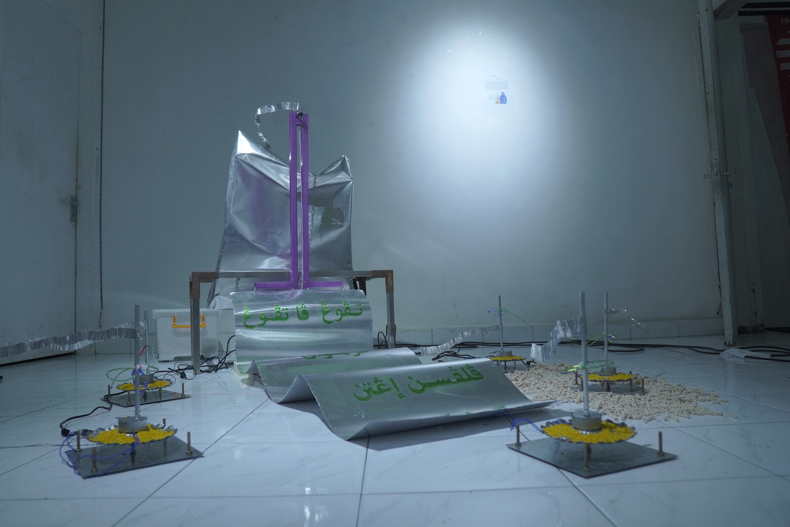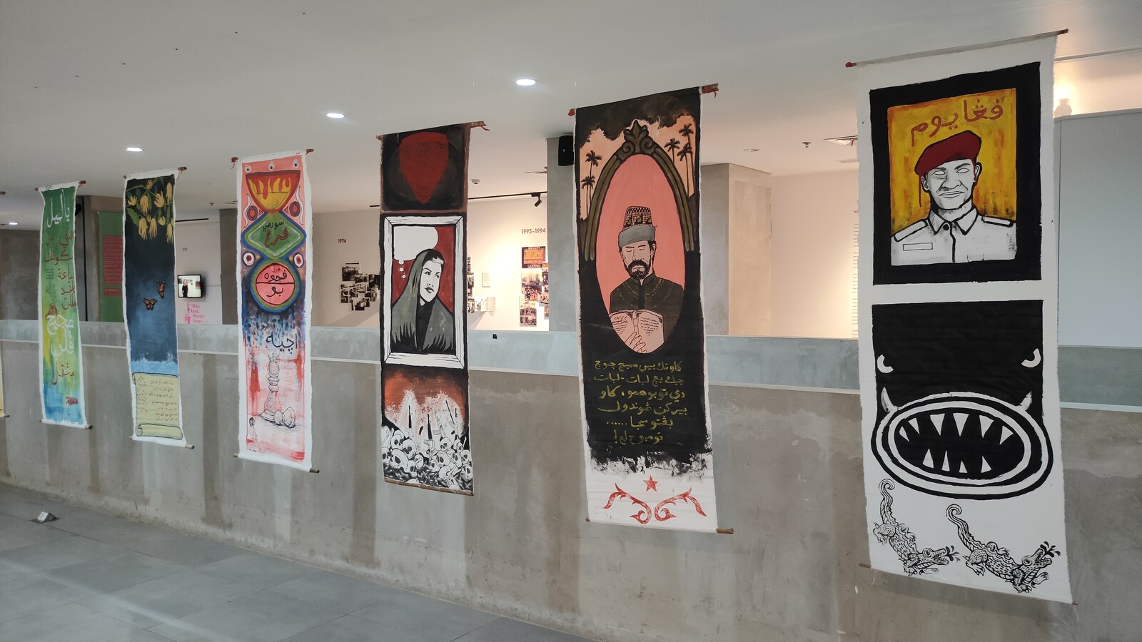 At Taman Ismail Marzuki, this lends certain portions of the biennial a makeshift feel, with no clear categorization of its constituent elements. Works made by organizers-cum-artists Majelis Jakarta, for example, are set among those from the Lab Indonesiana: Baku Konek program (eighteen artists/collectives) and the sub-strands of the Curating Topography Trilogy program (sixty artists/collectives), without physical division or designated exhibition flow. This deliberate refusal of spatial organization is also reflected in the biennale’s events timetable. Many programs—performances, artist talks, film screenings, and zine launches, especially those organized by artist collectives in Palestine x Majelis Jakarta: Our People Are Our Mountains—were announced at short notice, often the day before.