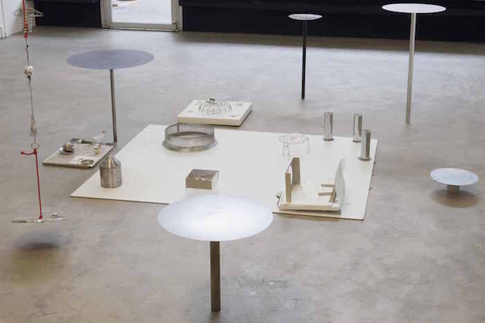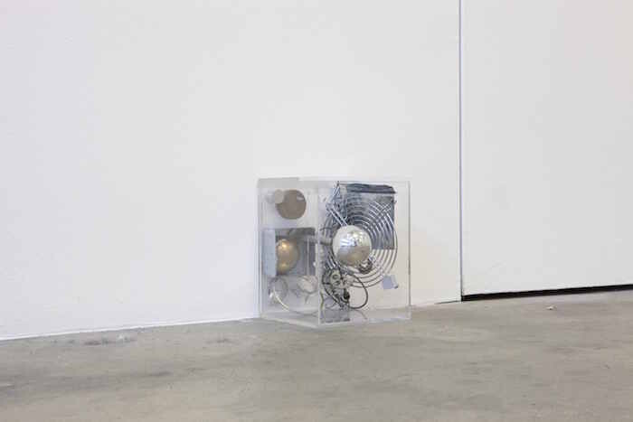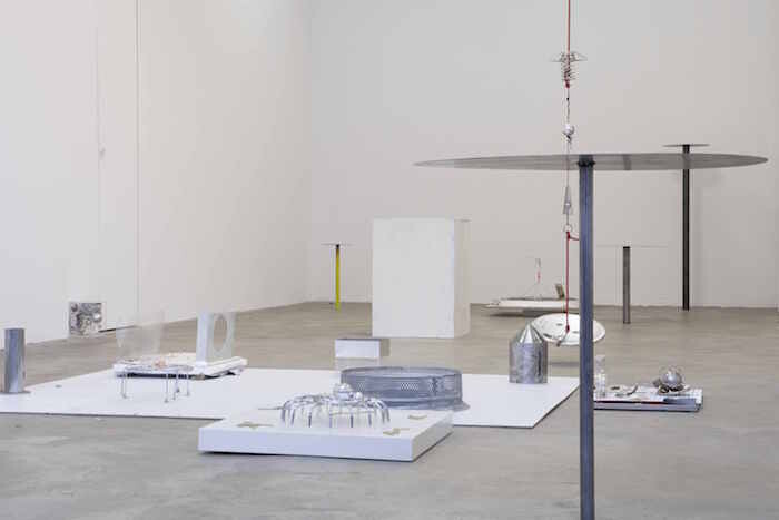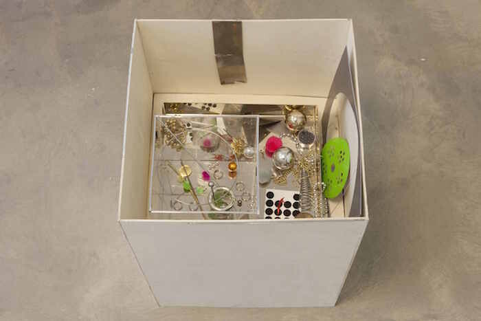 Usually Vorisek’s sculptures resound. This quality of his work may be described as an arrested means of performance—repercussioning, reverberating, resonating. Consider, for instance, the metal spinners the artist bought during a residency in China: whip them hard with a lash (as he did for his 2015 performance Whip Top Drone at Forde, Geneva) and they’ll make a gnarly, nearly hallucinatory, vaguely technoid sighing sound. At home in techno culture (as in the series of club nights he organizes with Mathis Altmann and Lhaga Koondhor, called H.O.M.E. [House Of Mixed Emotions]), here, the artist takes his work a step further, unleashing it from all use, keeping the sound to himself, and presenting something more: crumbling boxes of plywood and Plexiglas, sparkly beads, bright white display pads, a lot of metal (not techno)—and still all that resounds. Live in your head (as they say). Traces of fancy, traces of home—like the one we pay rent for, or which we fancy not to, which we may share, with its things, and people.